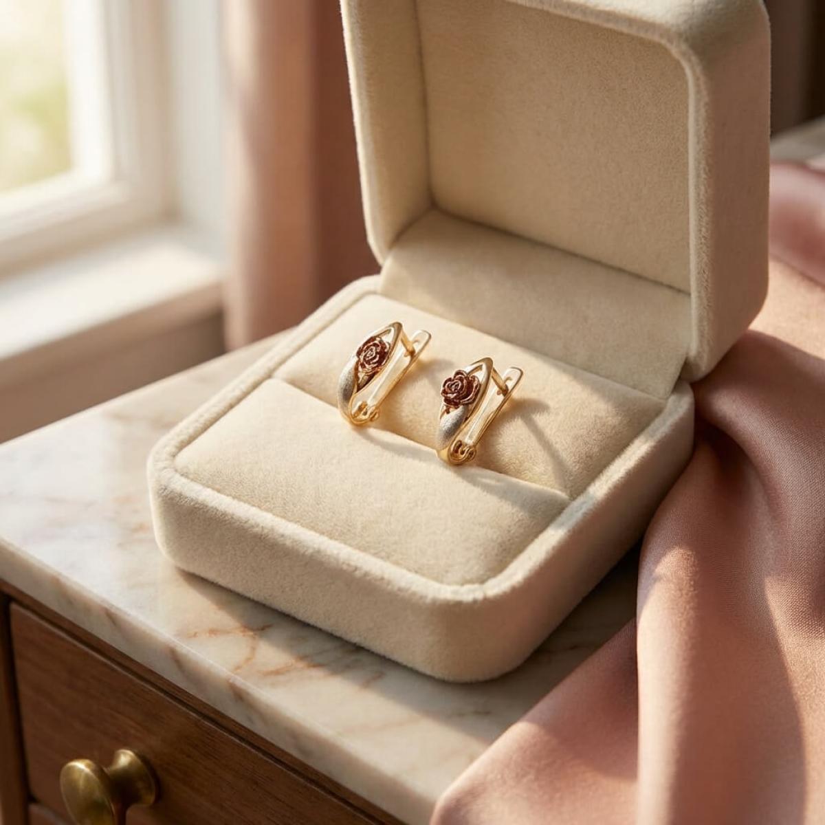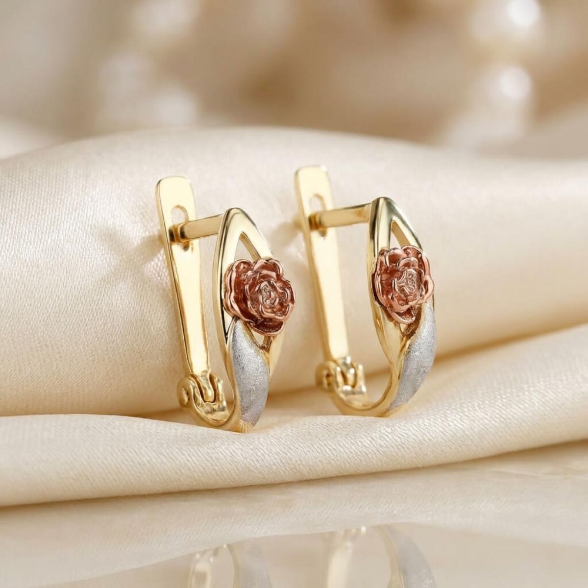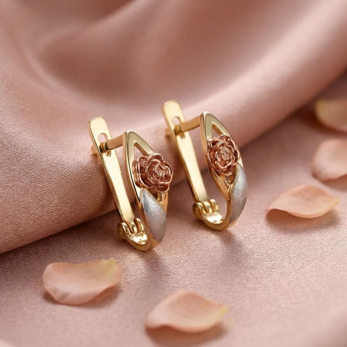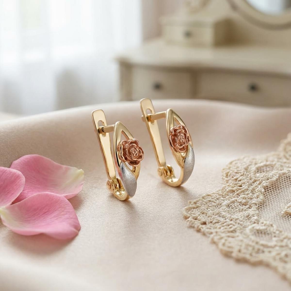 Основата е съставена от класическа жълта златна сплав, а лицевата част, оформена като цвете, е изработена от бяло и розово злато. Крайният резултат е едно брилянтно украшение, подходящо както за специални поводи, така и за ежедневието. Липсата на масивна структура и висящи елементи ги прави подходящи дори за ученички и студентки.
