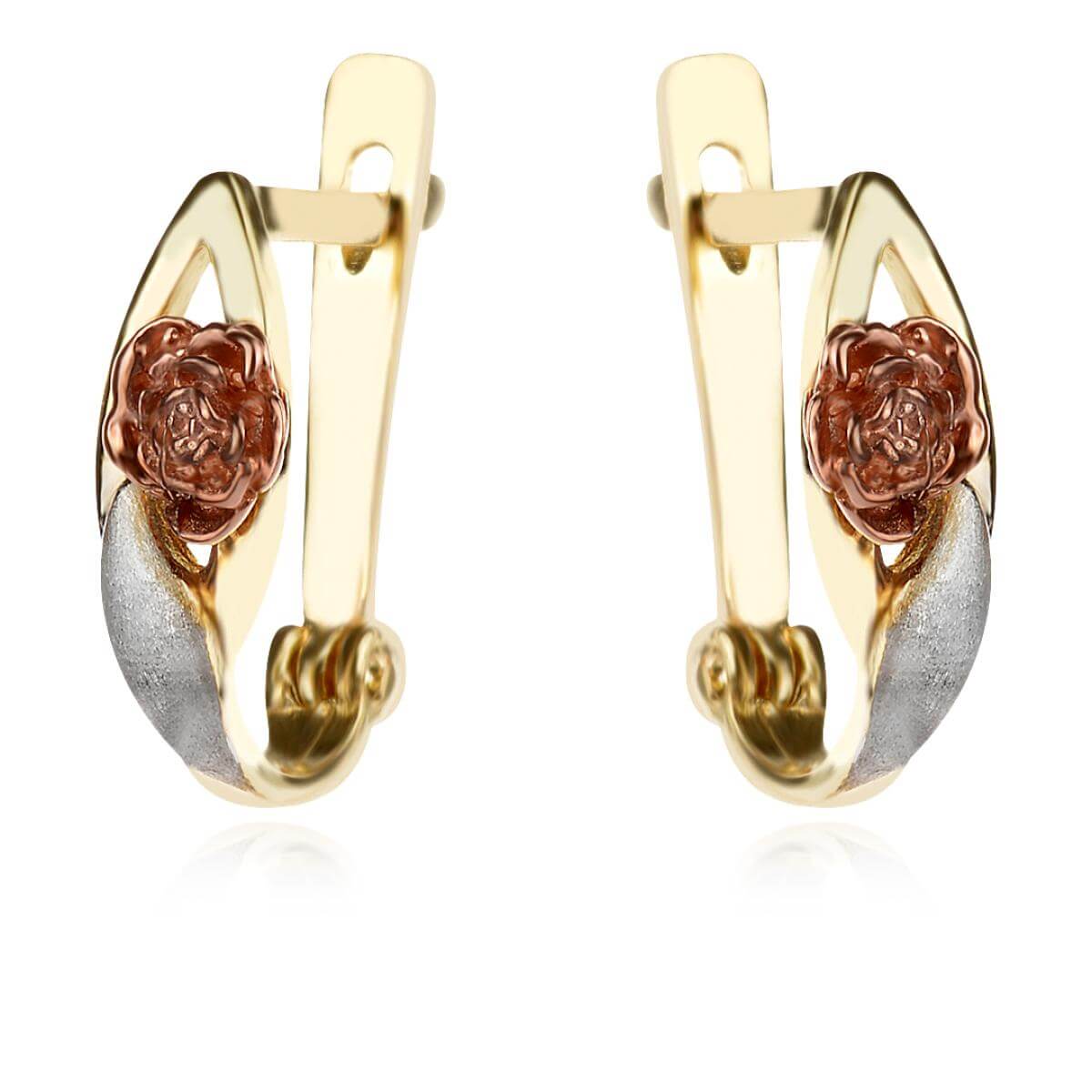 Едновременно елегантни и нежни, тези обеци, внимателно изработени от злато 14 К, излъчват усещане за съвършенство. Акцентът тук е умелото съчетание на 3 цвята злато -бяло, жълто и розово, което придава на модела свеж и изискан вид. Уникален дизайн, който с лекота ще допълни вашата визия със стил и грация.