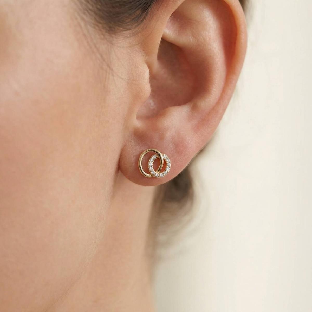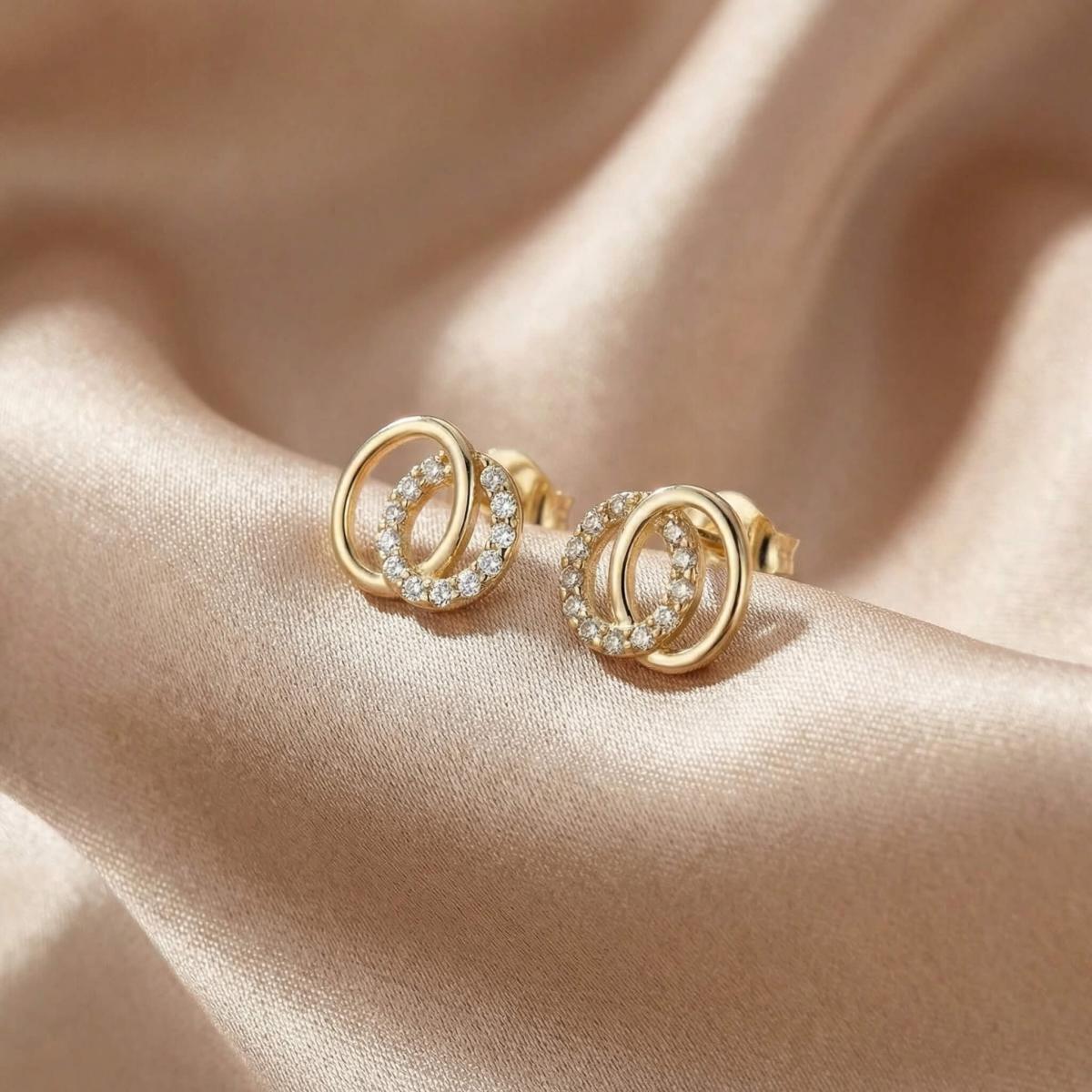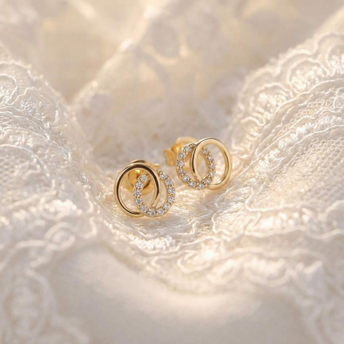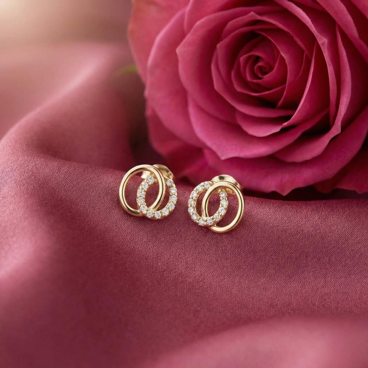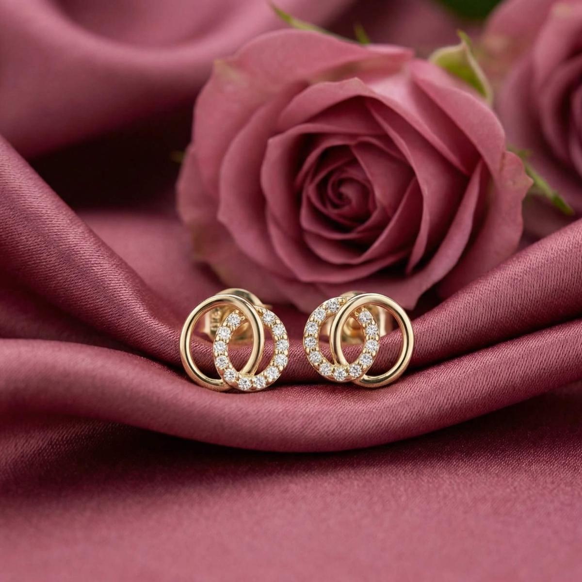 Обеците са изработени от качествено злато и представляват два преплитащи се овала. Единият овал е украсен с бели циркони, които му придават блясък и изтънченост, докато другият овал е от жълто злато, което му придава топлина и уникалност.
