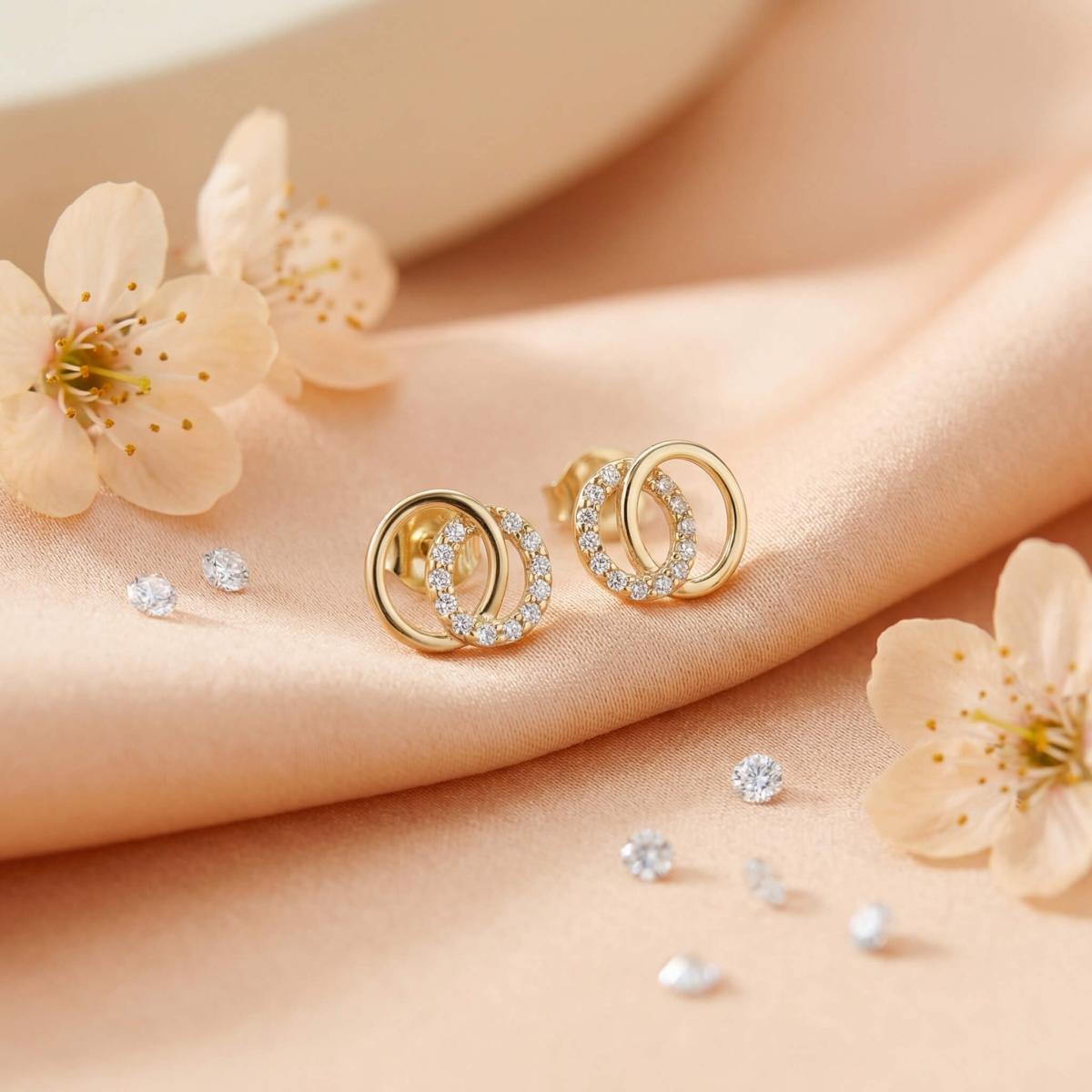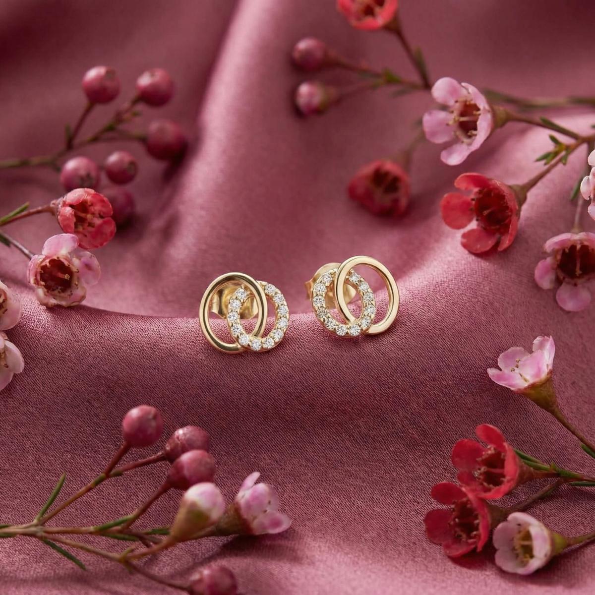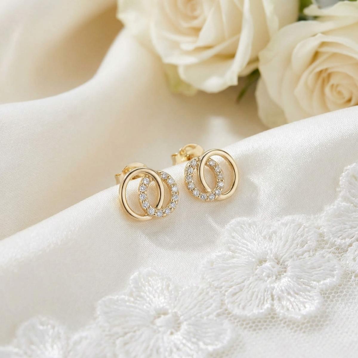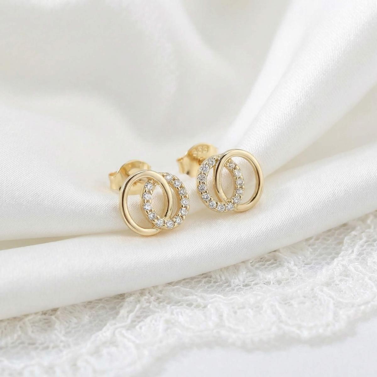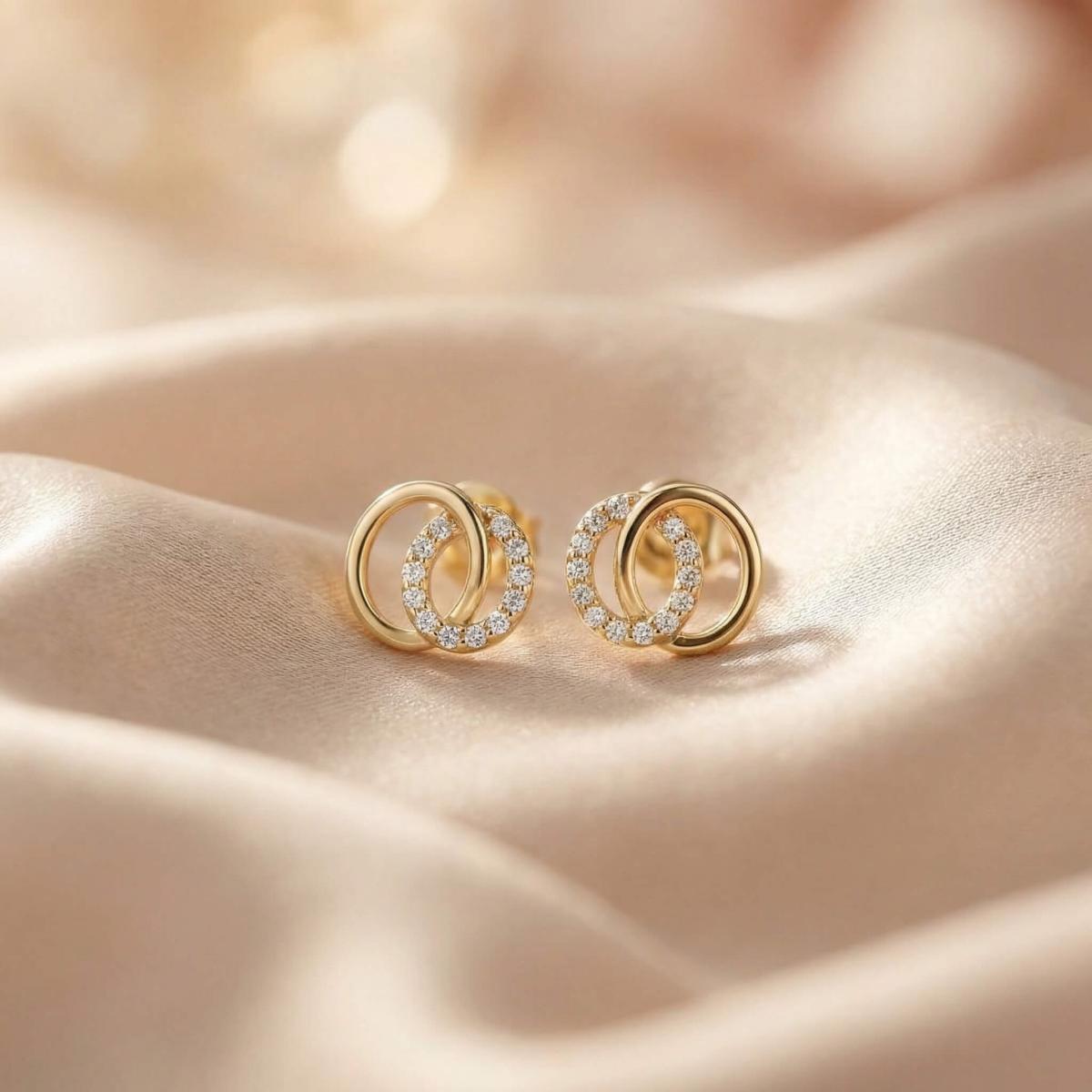 Обеците са изработени от качествено злато и представляват два преплитащи се овала. Единият овал е украсен с бели циркони, които му придават блясък и изтънченост, докато другият овал е от жълто злато, което му придава топлина и уникалност.