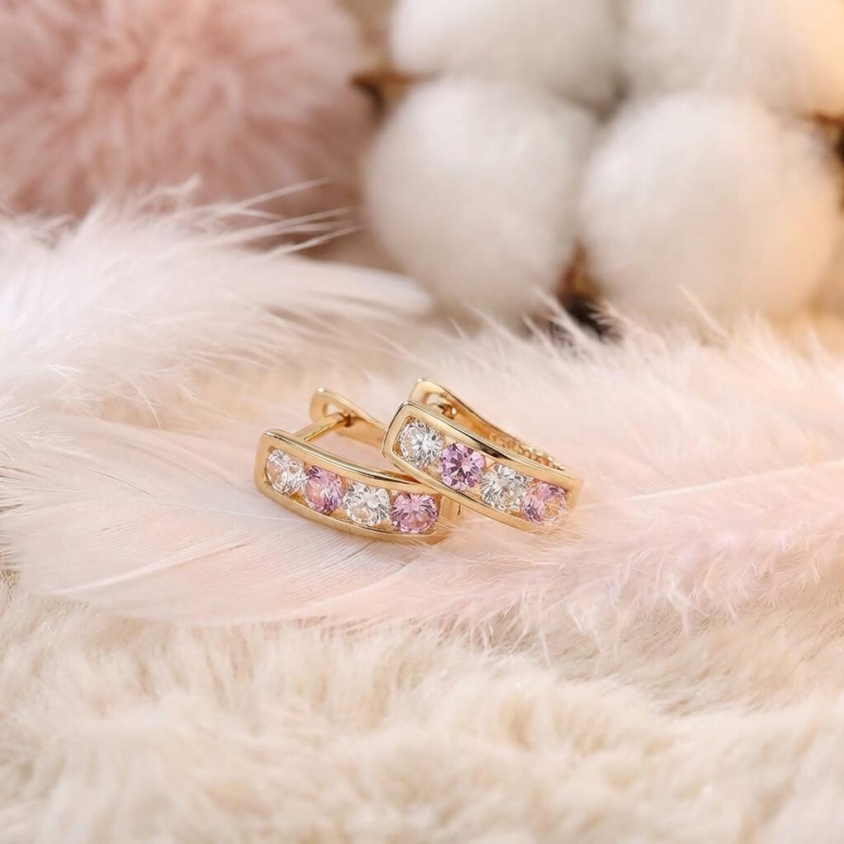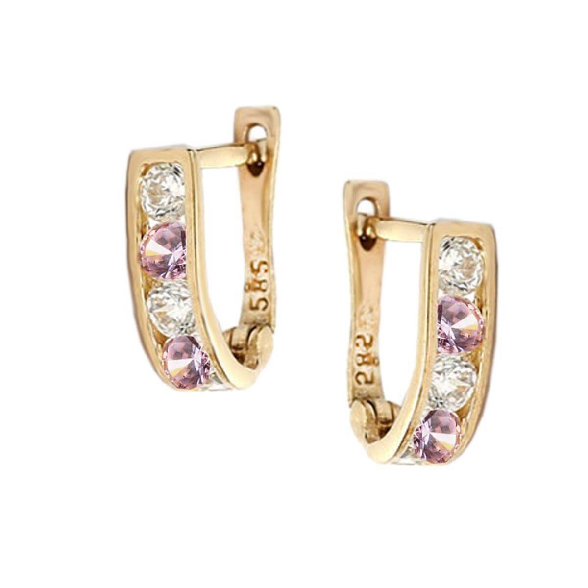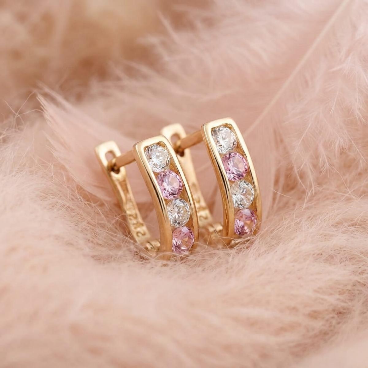 Златни обеци с бели и розови циркони.