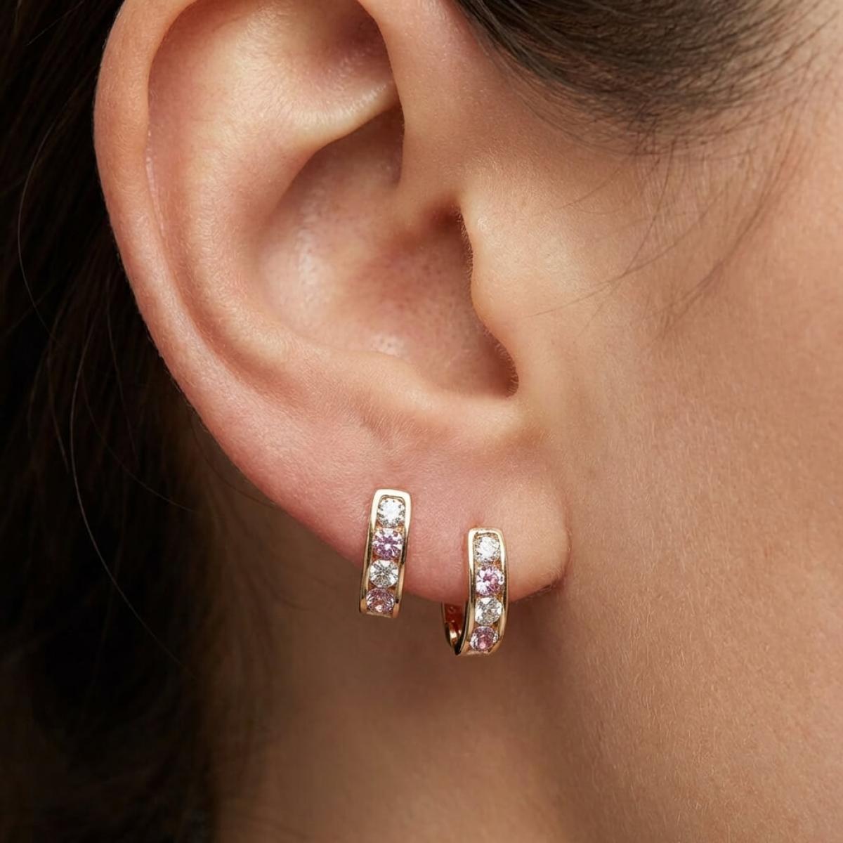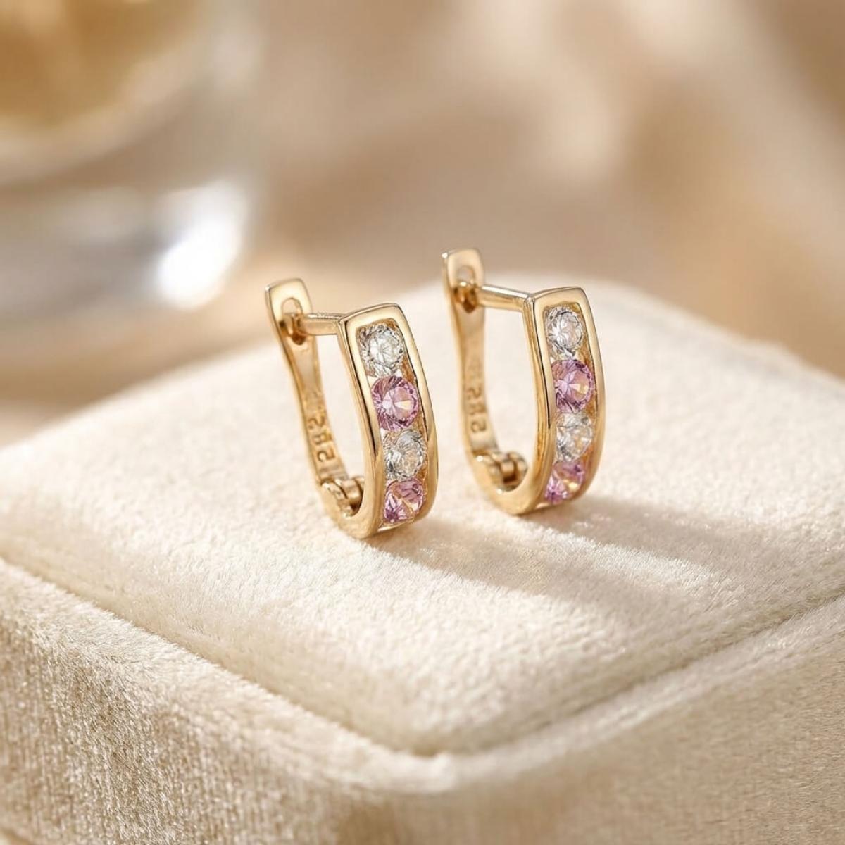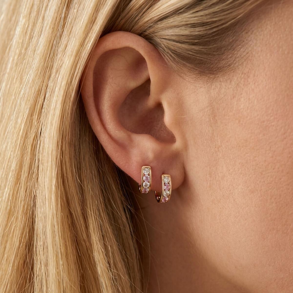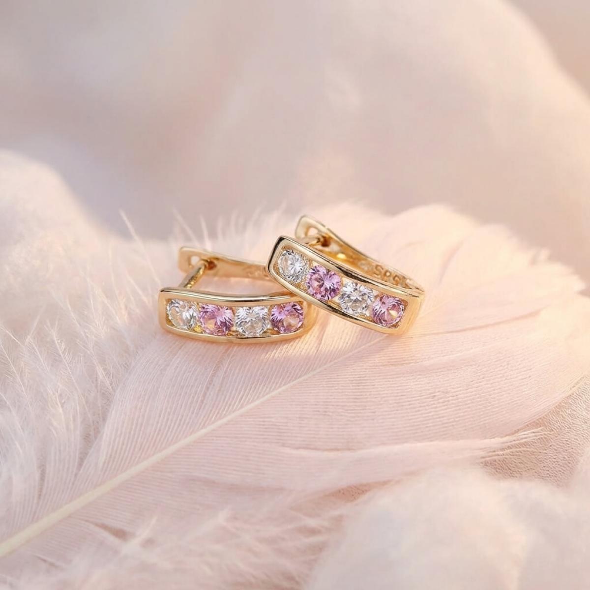 Златни обеци с бели и розови циркони.
