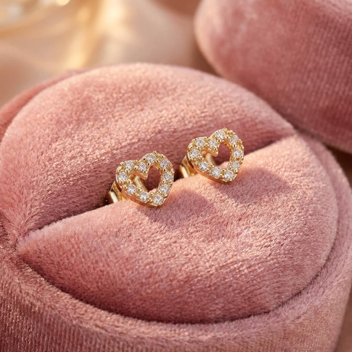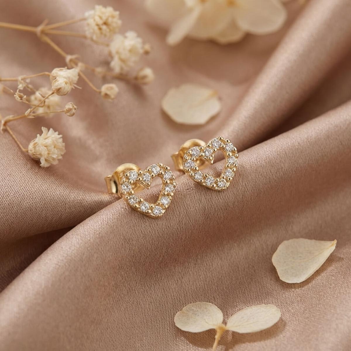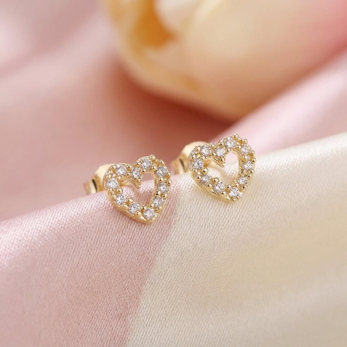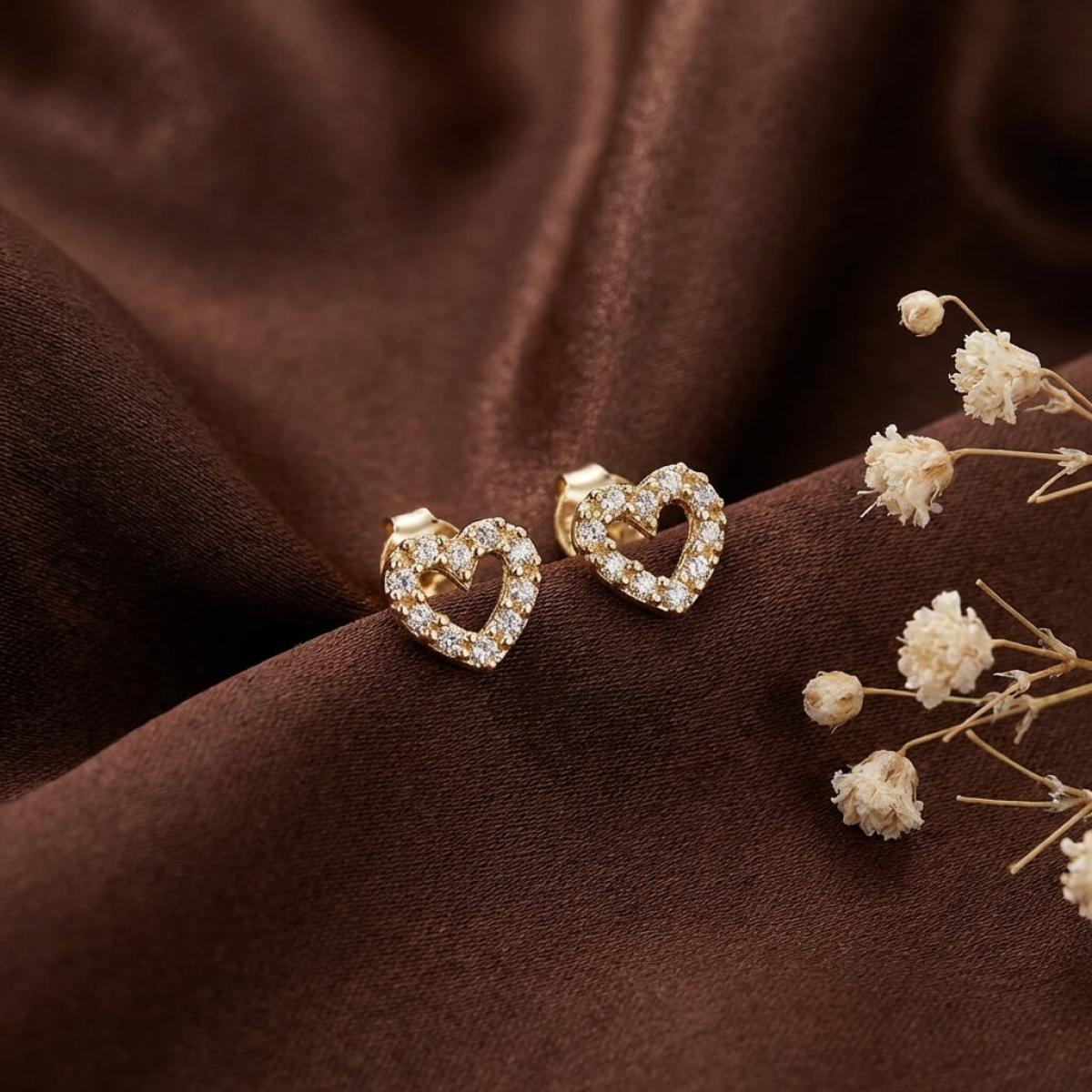 Нежни златни обеци с бели циркони във формата на сърце