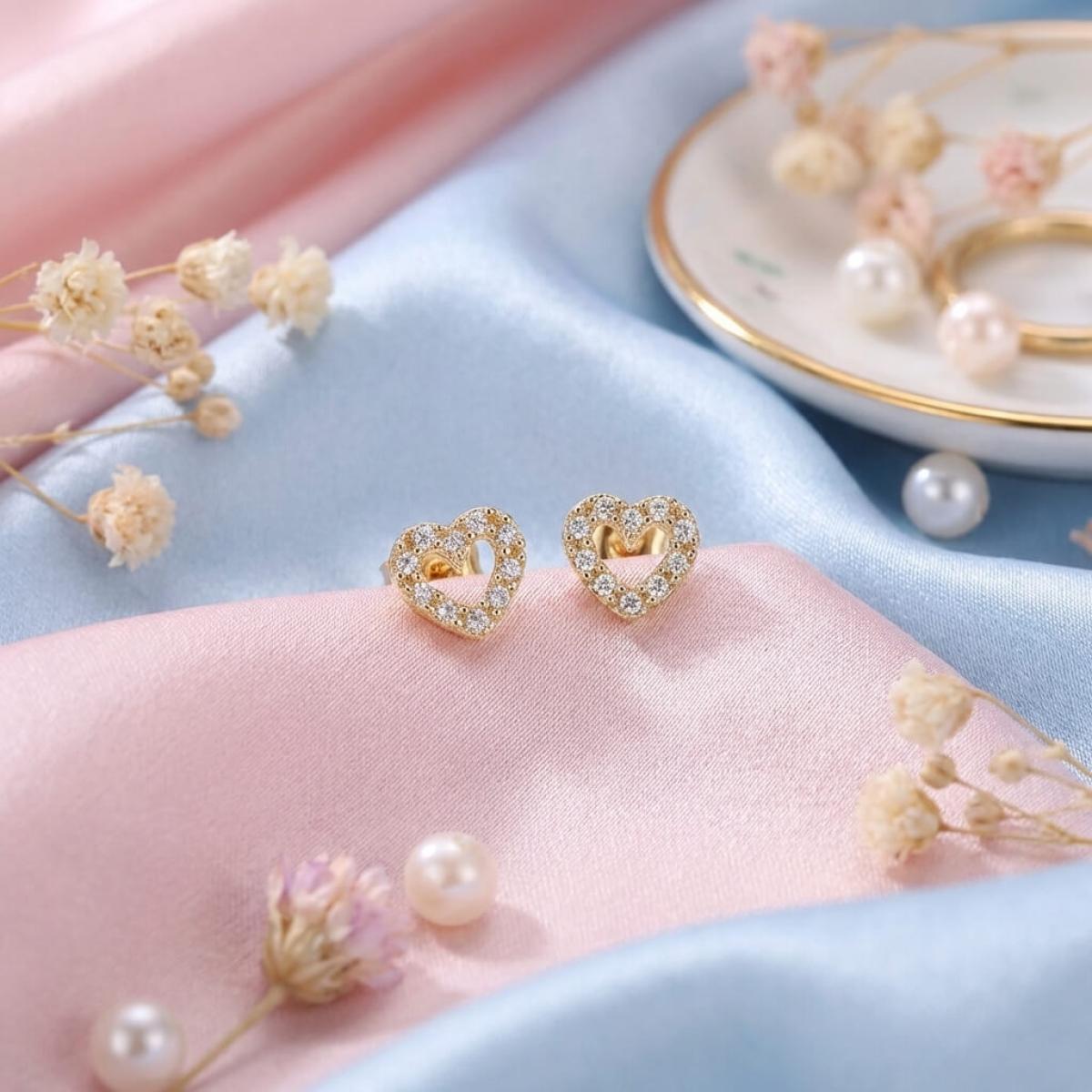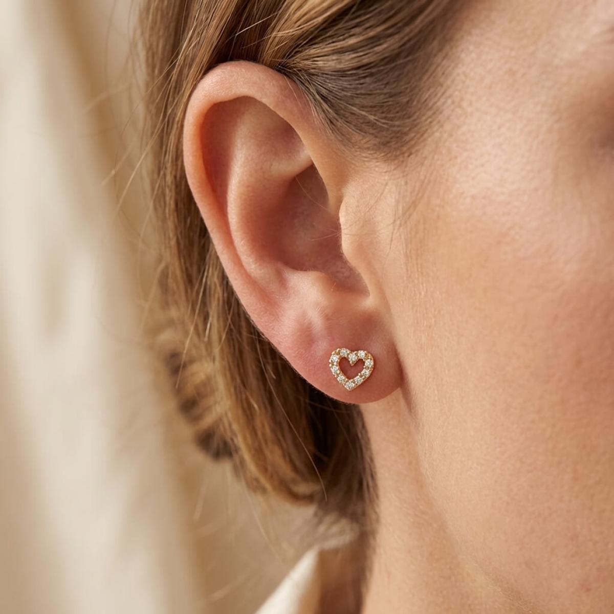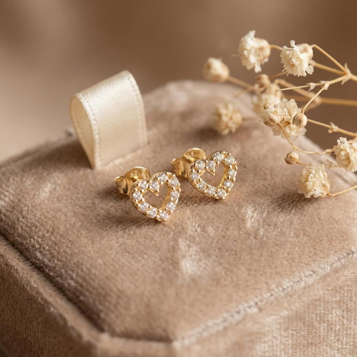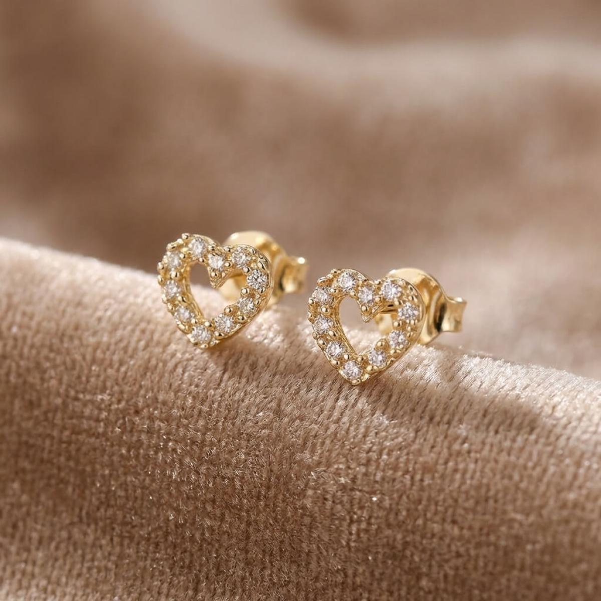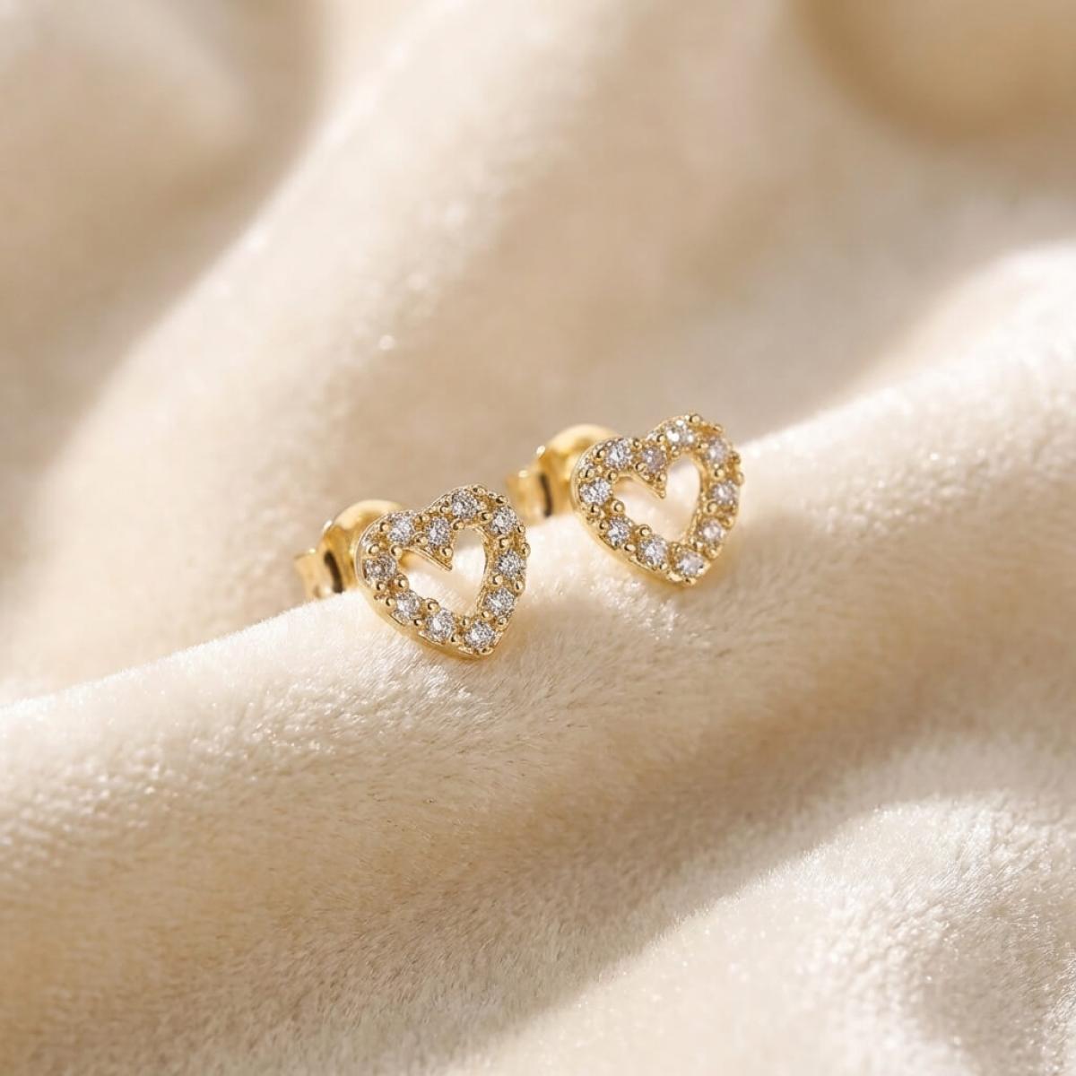 Нежни златни обеци с бели циркони във формата на сърце
