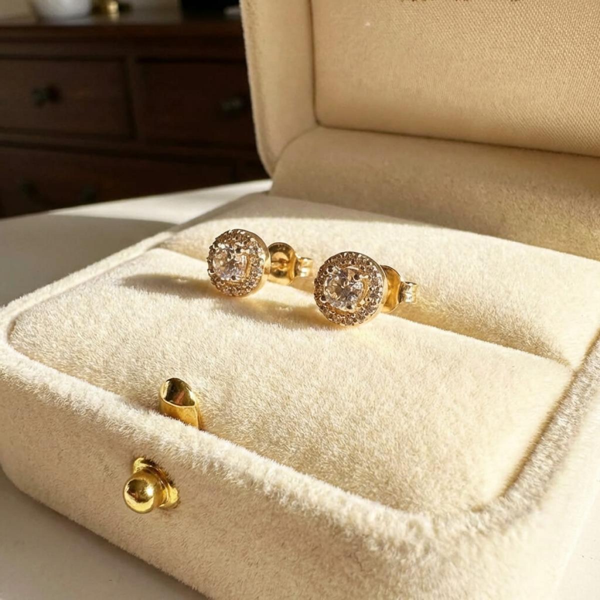 Дизайнът на обеците Валери е класически – кръгла чашка, в която са инкрустирани множество малки бели циркони и един голям в центъра. Фиксирането на прозрачните циркони в златна кухина им придава топли жълто-кафеникави отблясъци. Играта на отблясъците прави обеците силно забележими, въпреки малкия им размер.