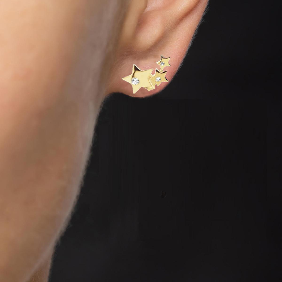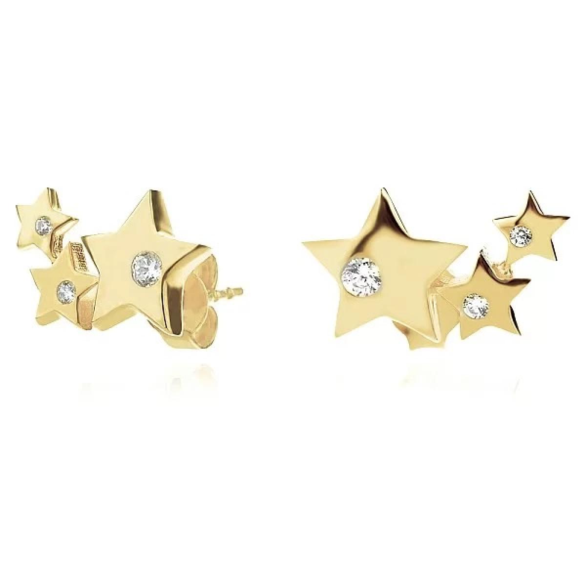 Вдъхновени от светлината на далечните звезди на небето, тези обеци са изработени с внимание към всеки детайл. Те представляват нежни златни звезди, които се издигат благородно от тъмния вечерен хоризонт. Кристално чистите циркони, поставени в сърцевината на всяка звезда, придават сияйност и обаяние на тези уникални бижута.