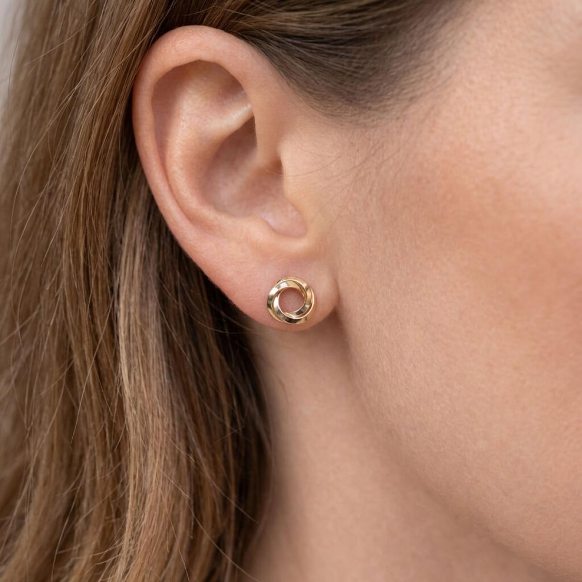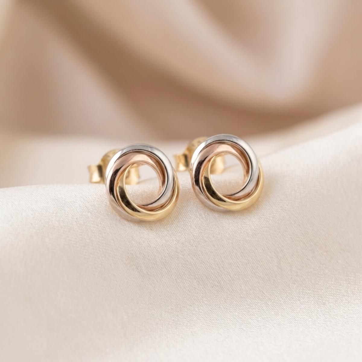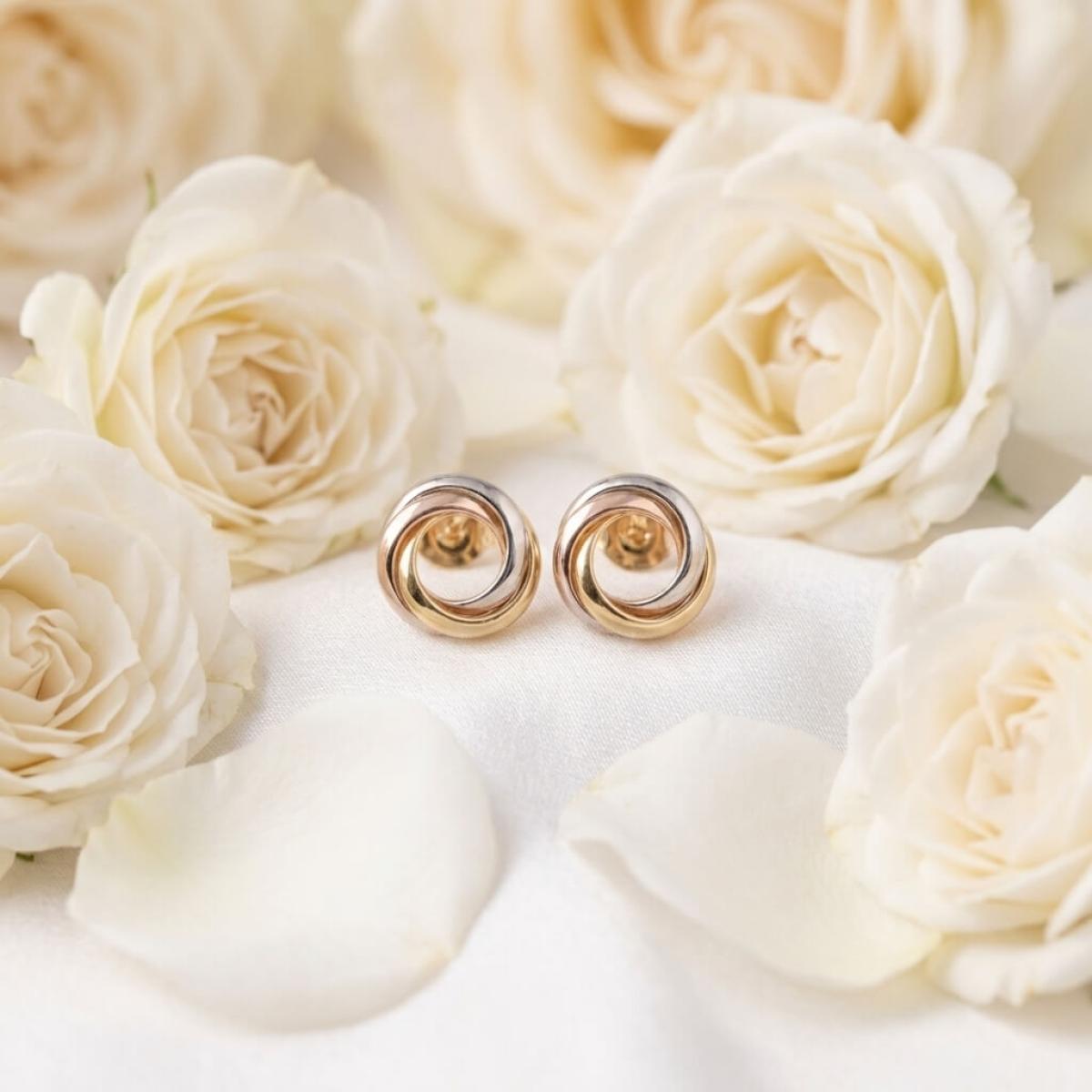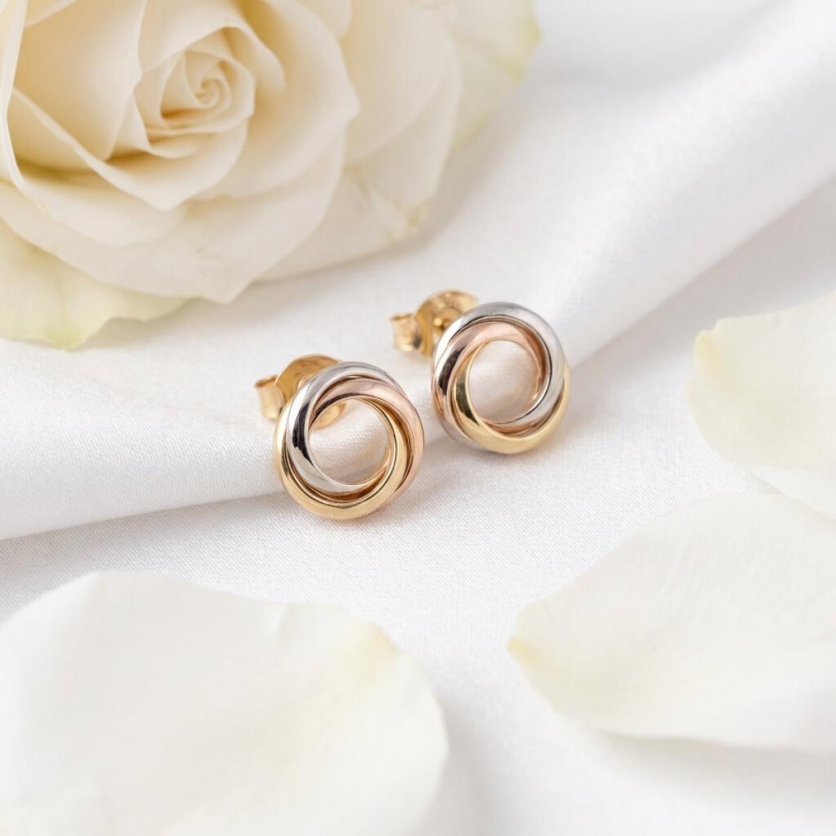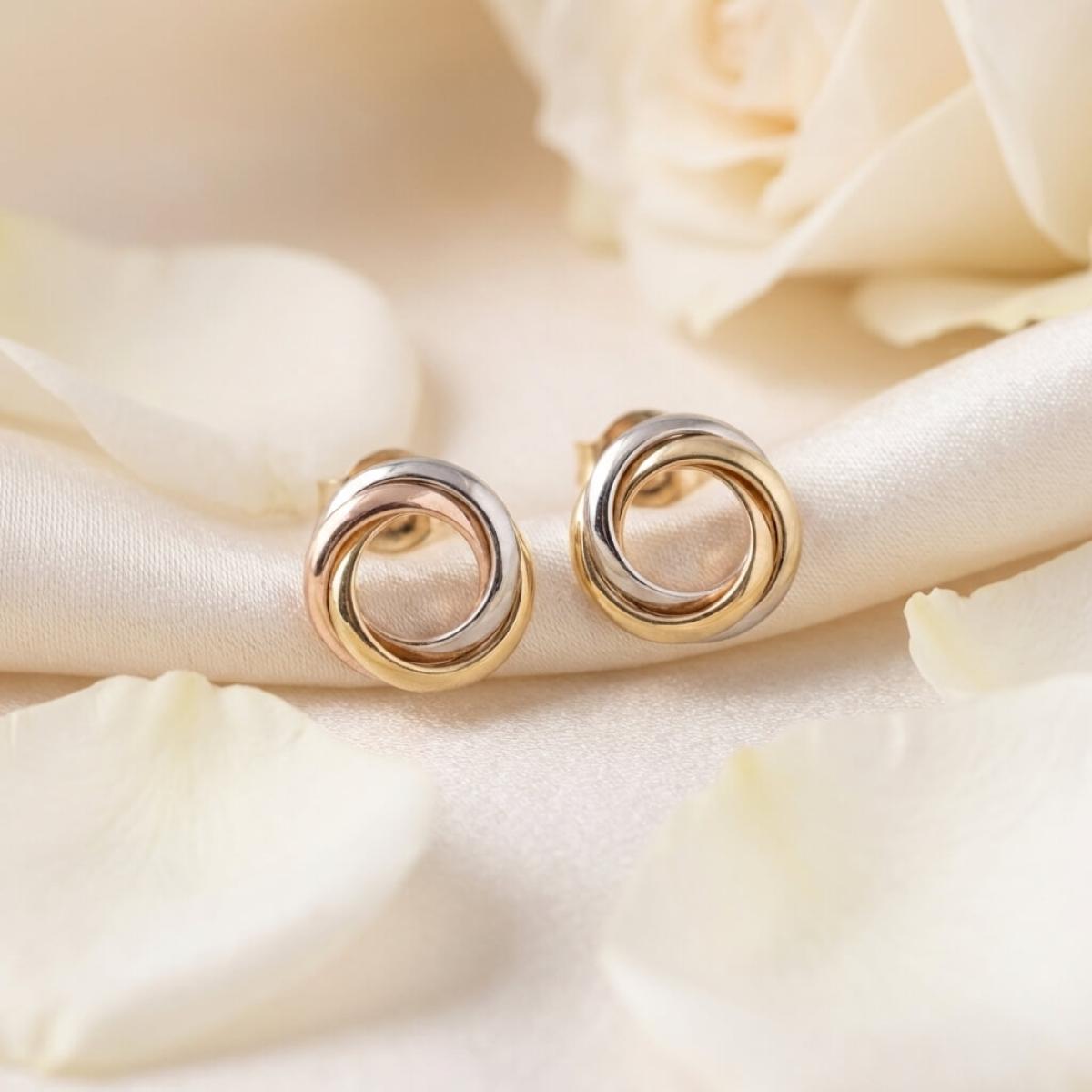 Елегантни златни обеци с модерен трицветен дизайн, съчетаващ жълто, бяло и розово злато. Преплетените кръгове създават изискан и стилен вид, който привлича вниманието и придава блясък на всяка визия. Подходящи са както за ежедневно носене, така и за специални поводи.