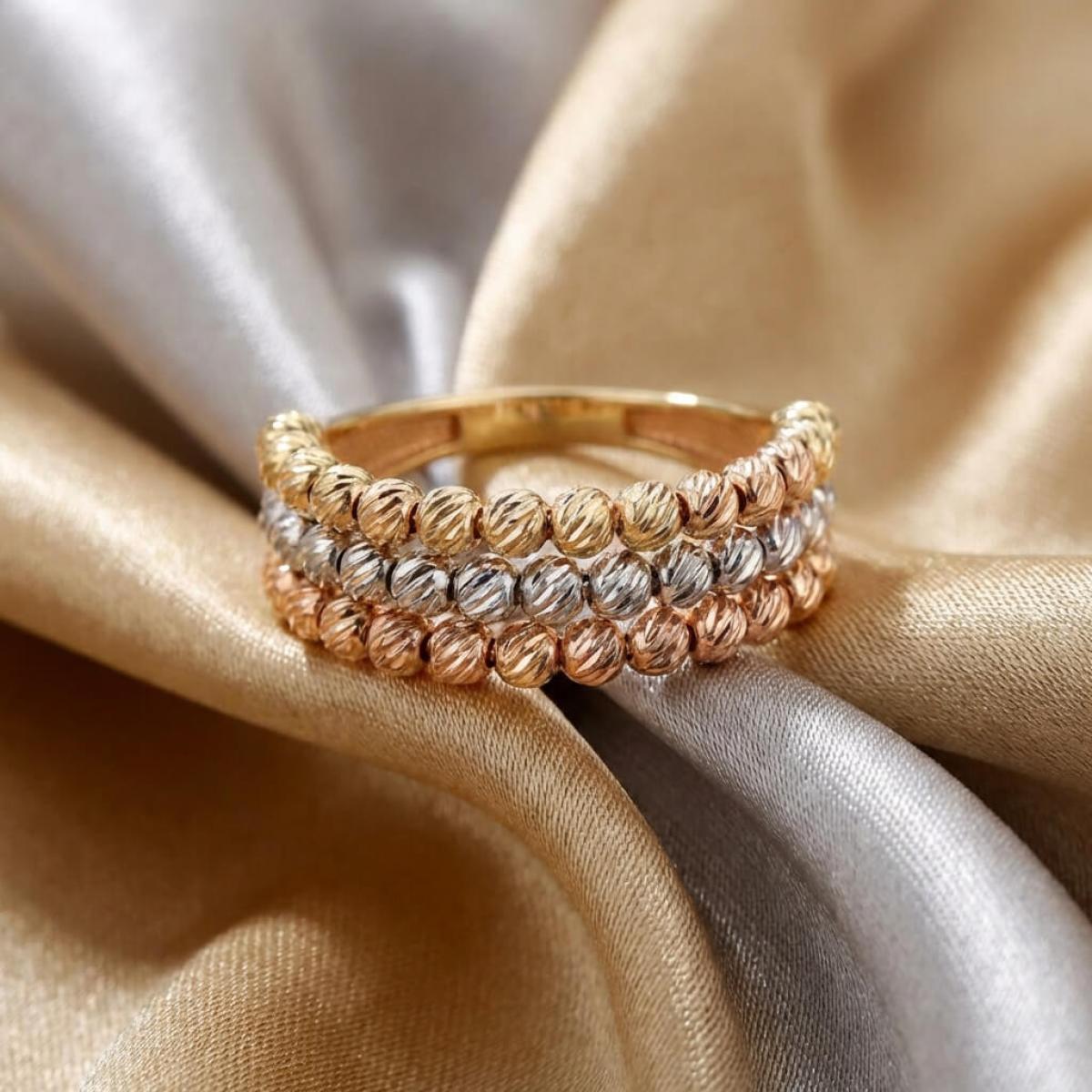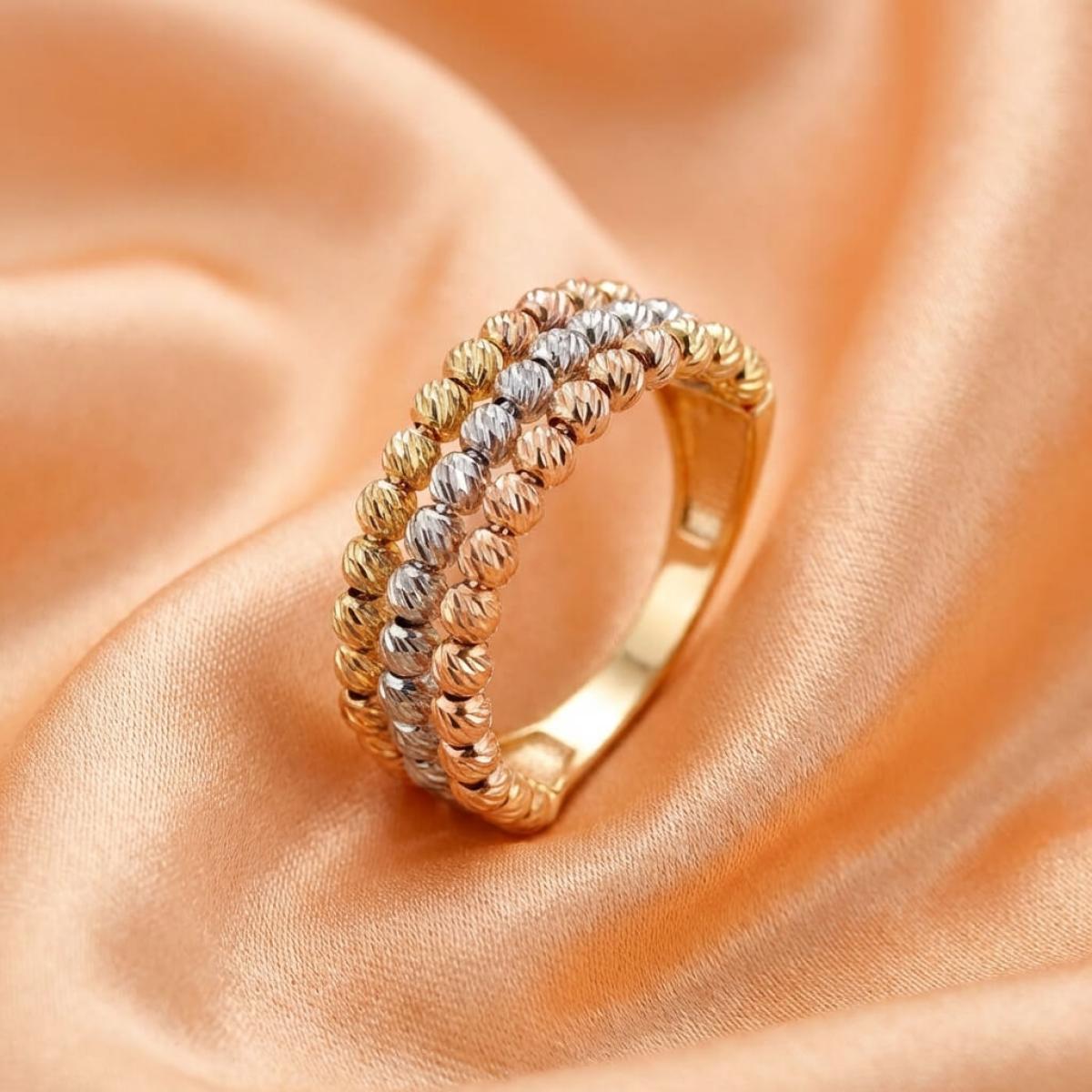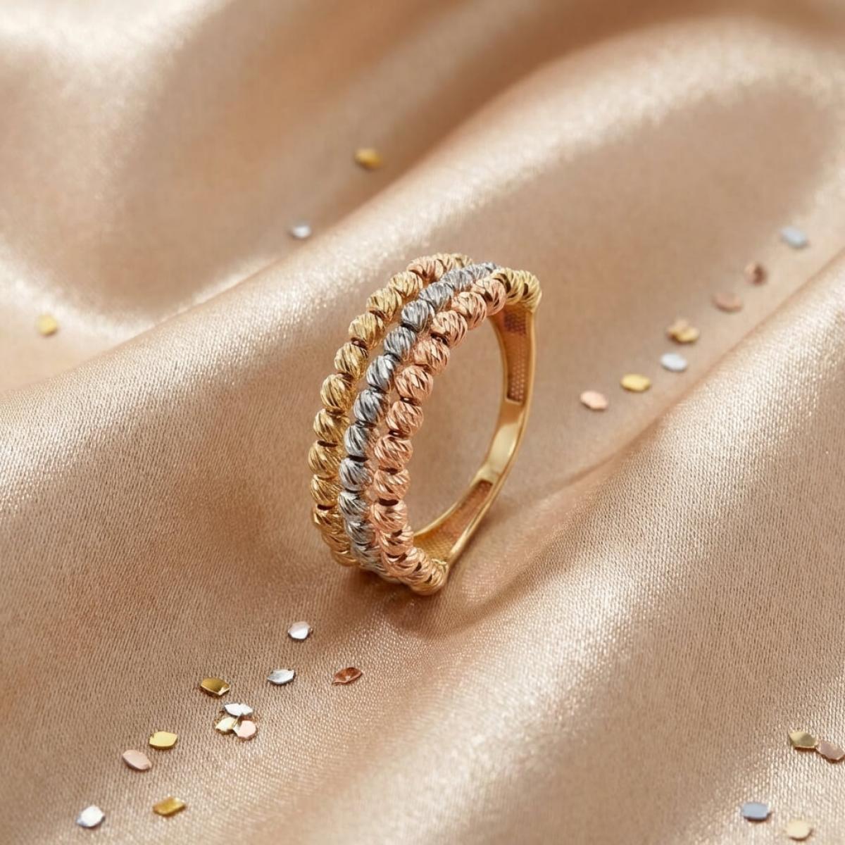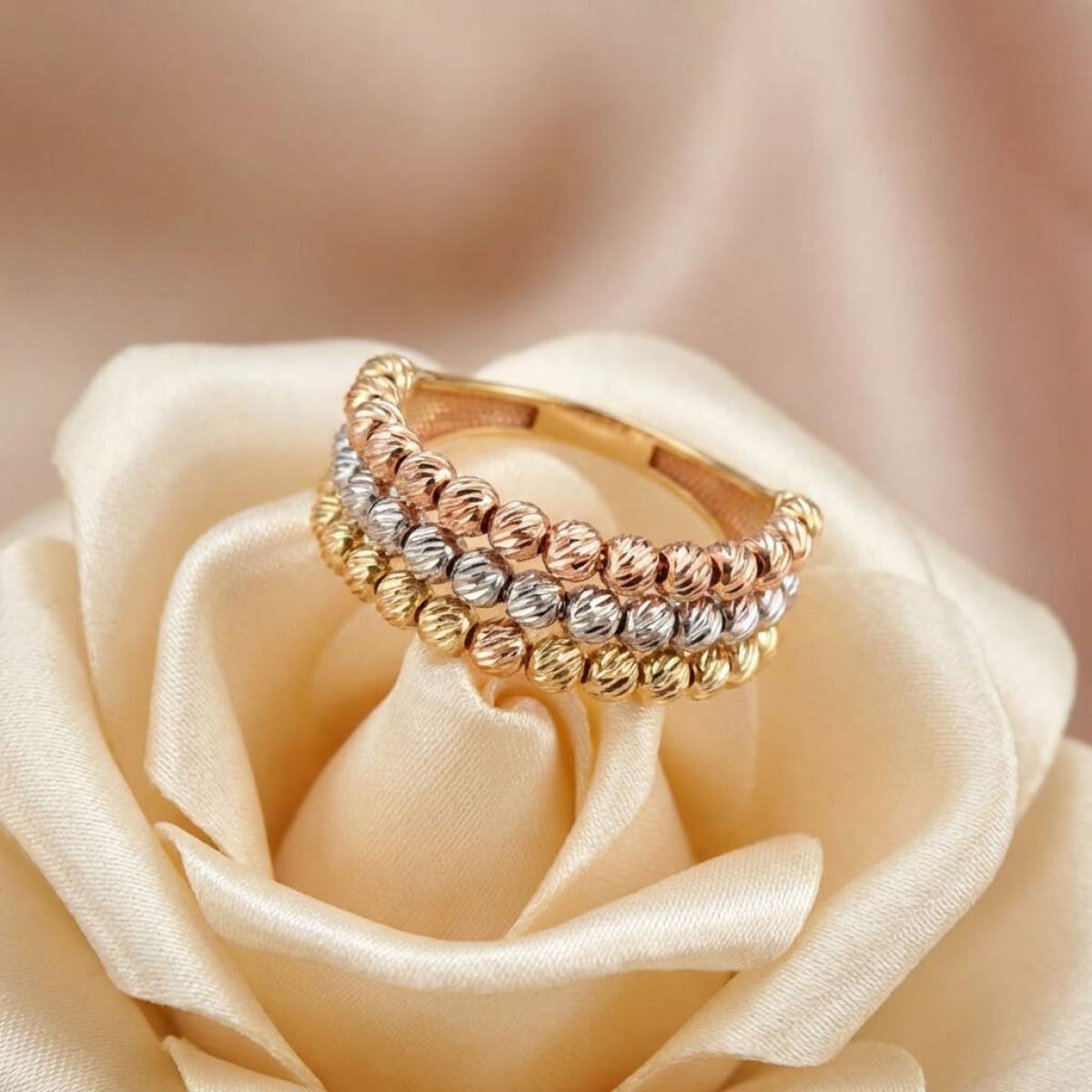 - Дамски златен пръстен с 3 реда топчета - бяло злато, жълто злато и розово злато
