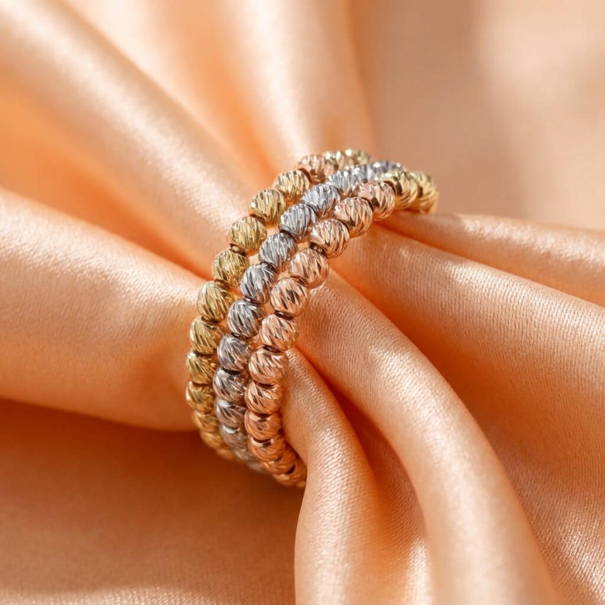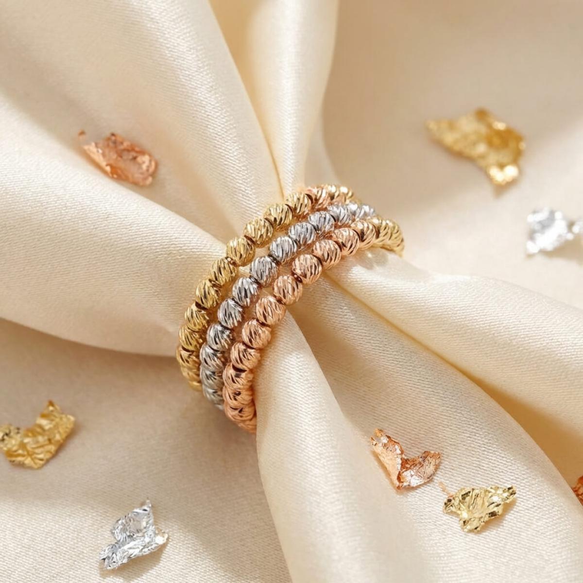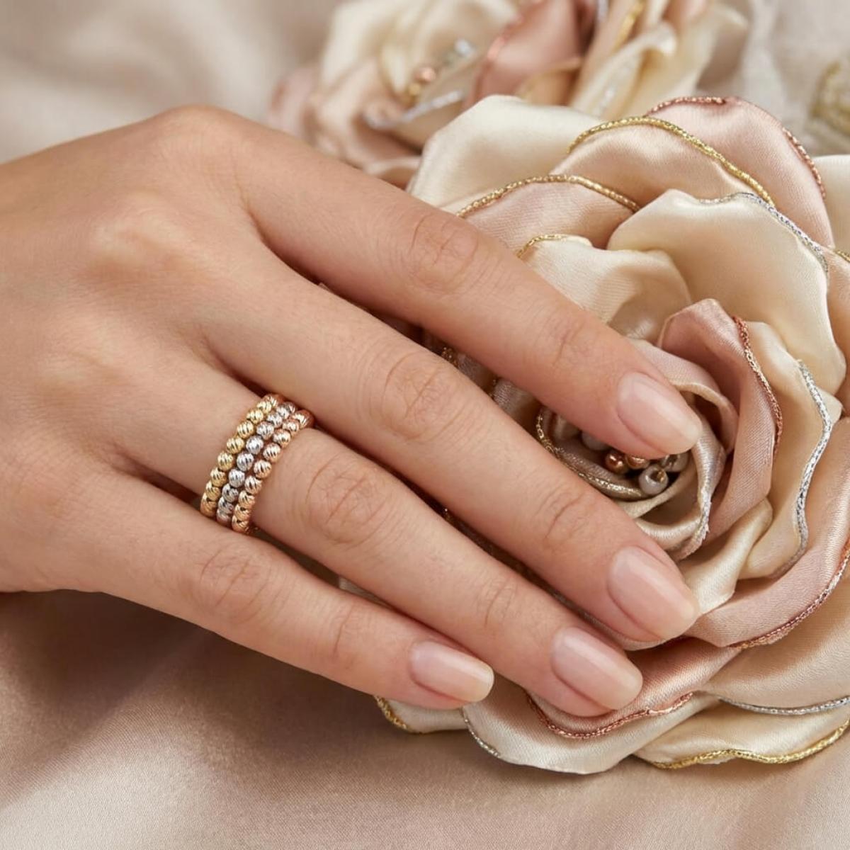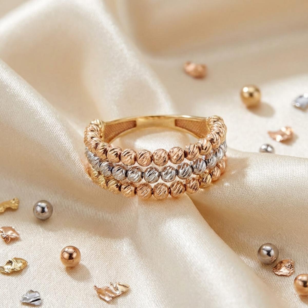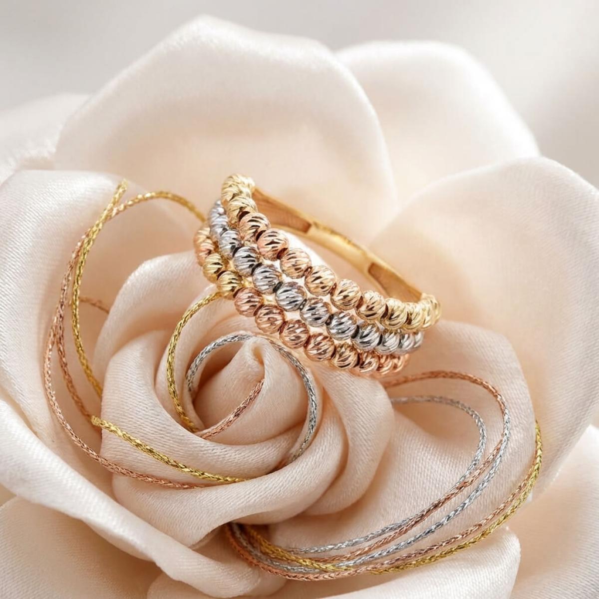 - Дамски златен пръстен с 3 реда топчета - бяло злато, жълто злато и розово злато