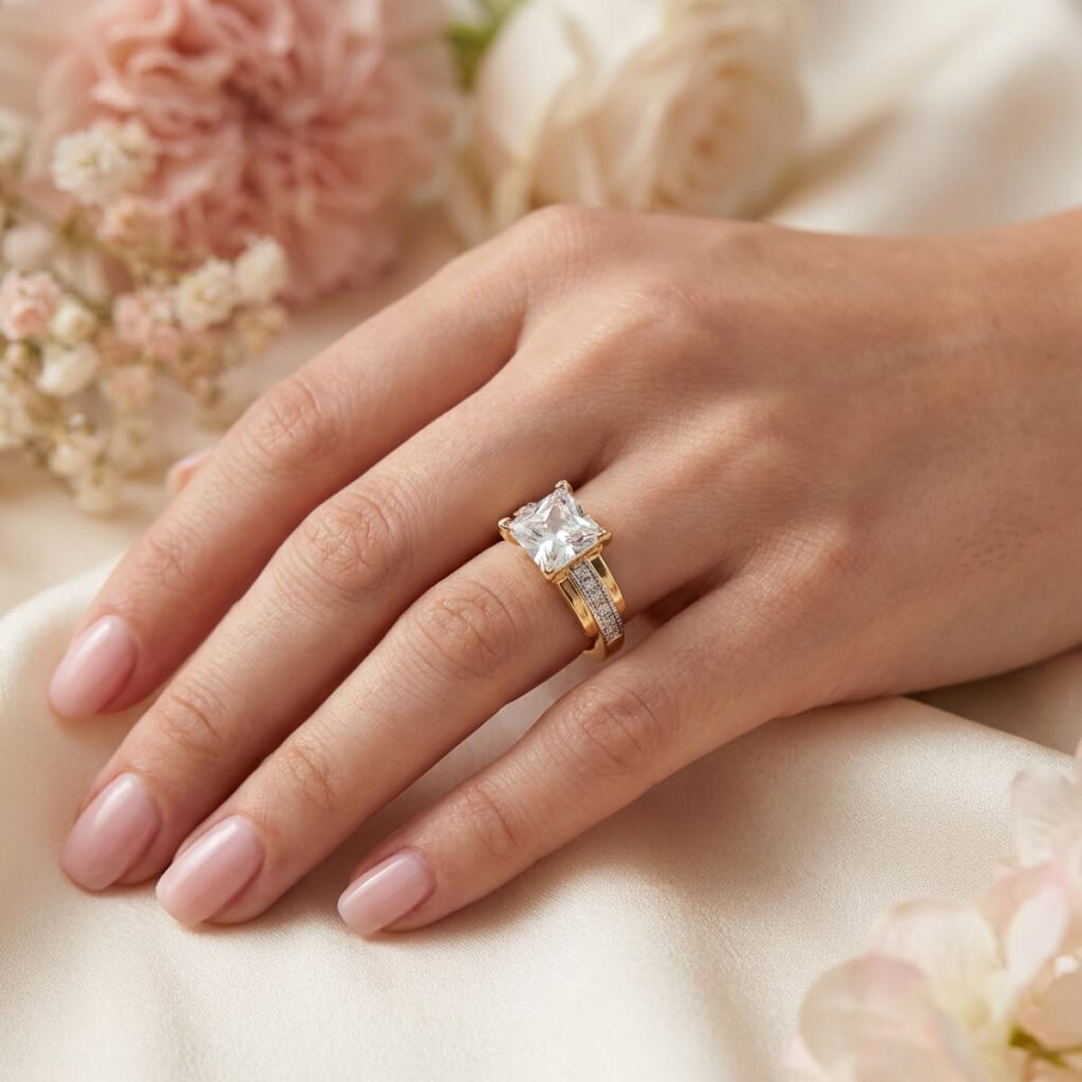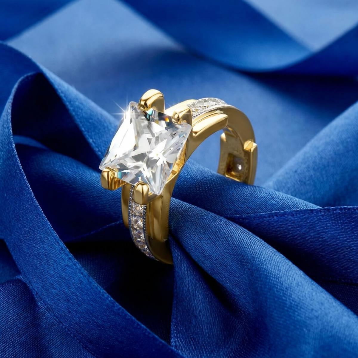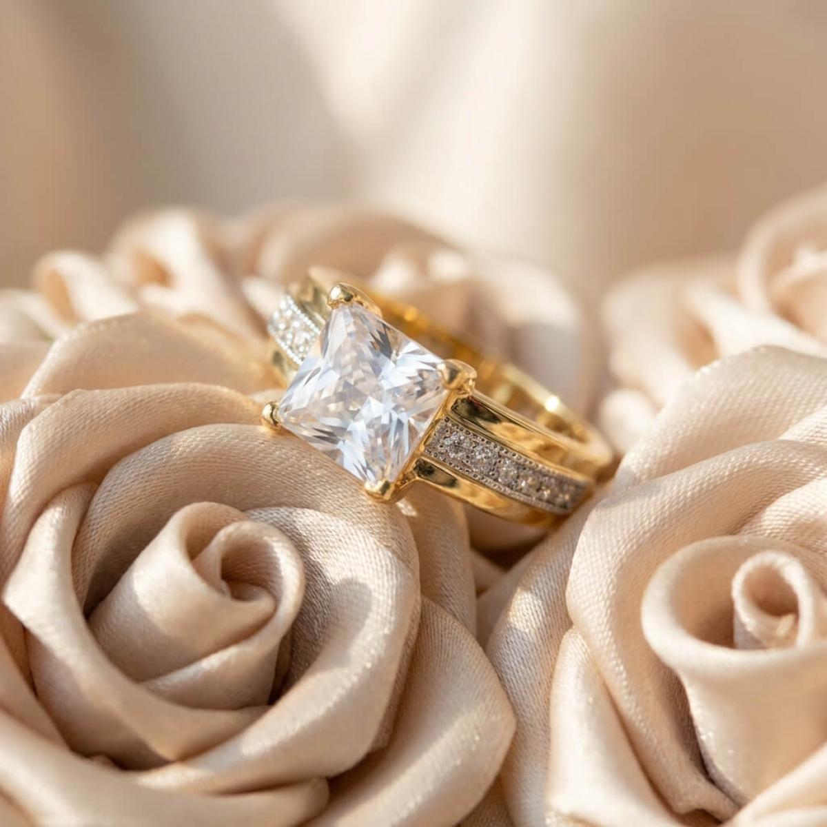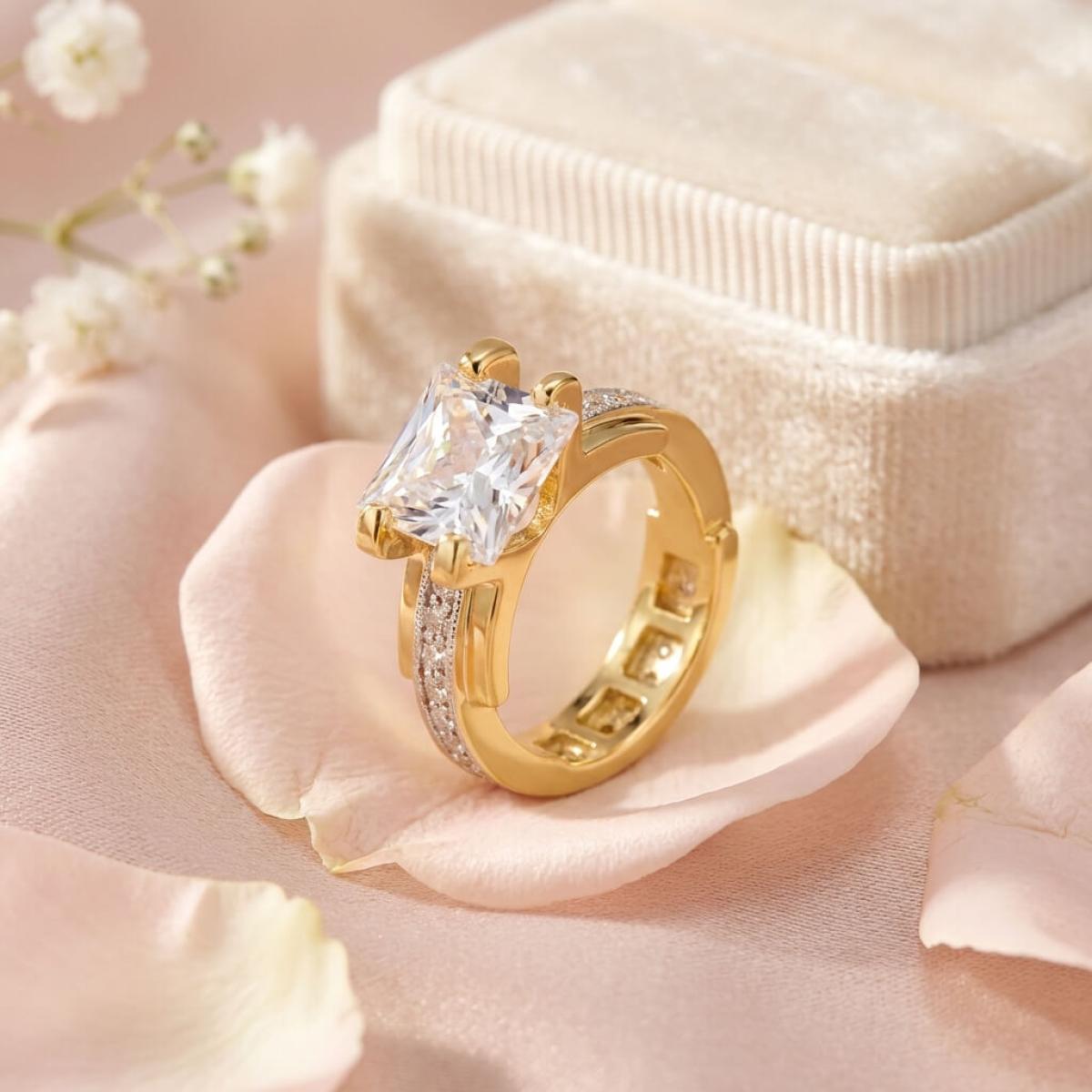 Централната точка на пръстена е украсена с изумителен циркон, който създава илюзията за искрящ диамант. Основата на пръстена е обкантена с циркони, които са известни със своята безупречна яркост и светлоотразителни свойства, което ги прави популярен избор за заместители на диамантите. Свързани с красота и вечност, цирконите символизират съвършенство и безкрайност на обещанието за вечна любов.