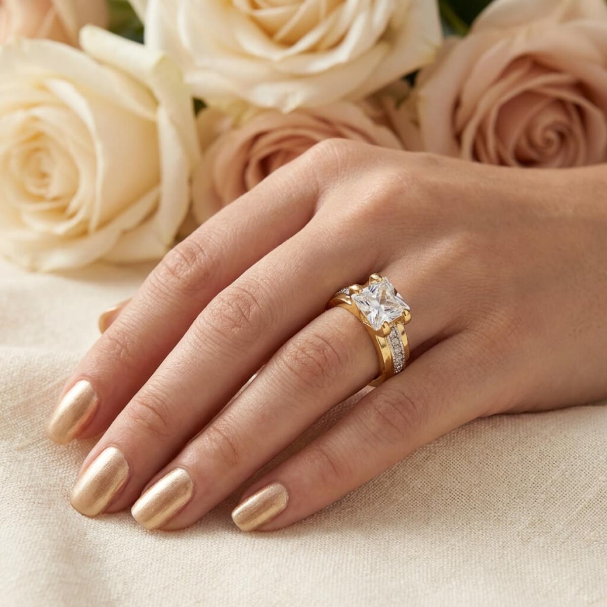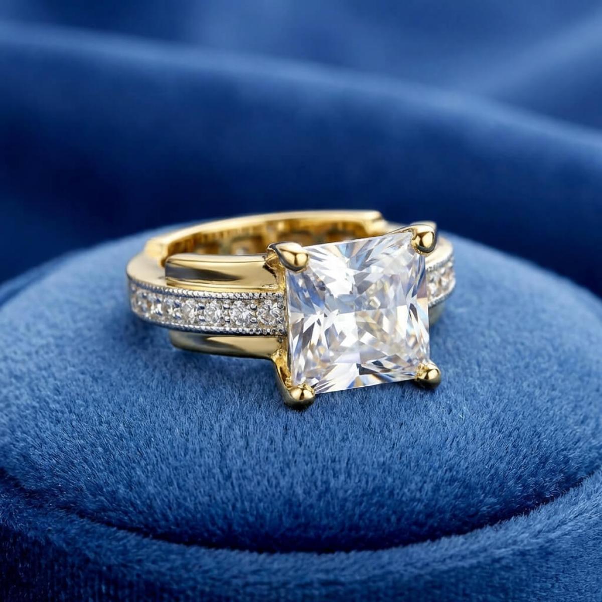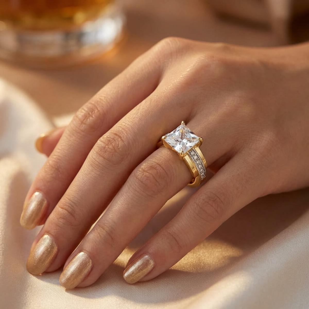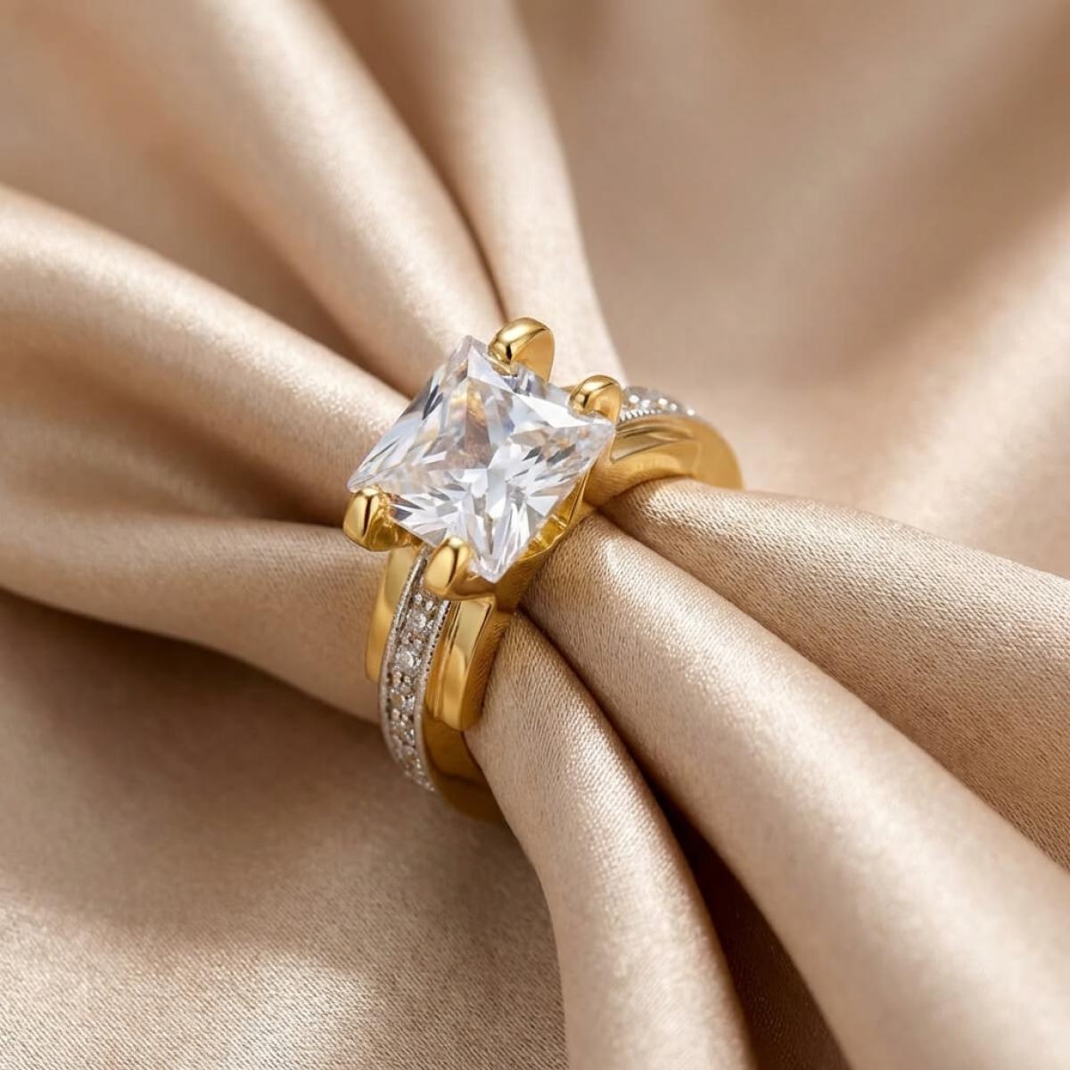 Централната точка на пръстена е украсена с изумителен циркон, който създава илюзията за искрящ диамант. Основата на пръстена е обкантена с циркони, които са известни със своята безупречна яркост и светлоотразителни свойства, което ги прави популярен избор за заместители на диамантите. Свързани с красота и вечност, цирконите символизират съвършенство и безкрайност на обещанието за вечна любов.