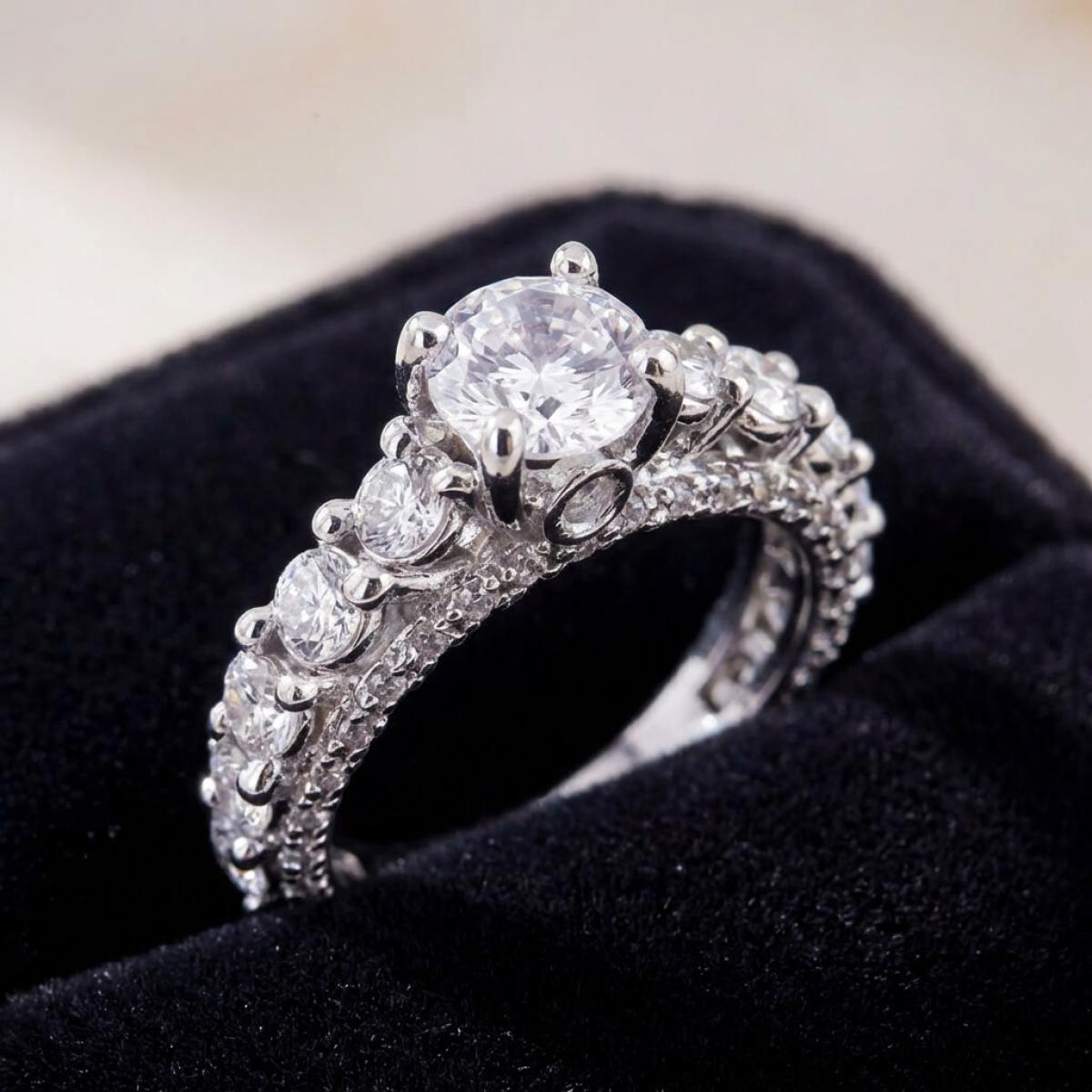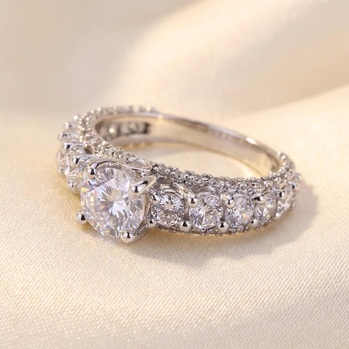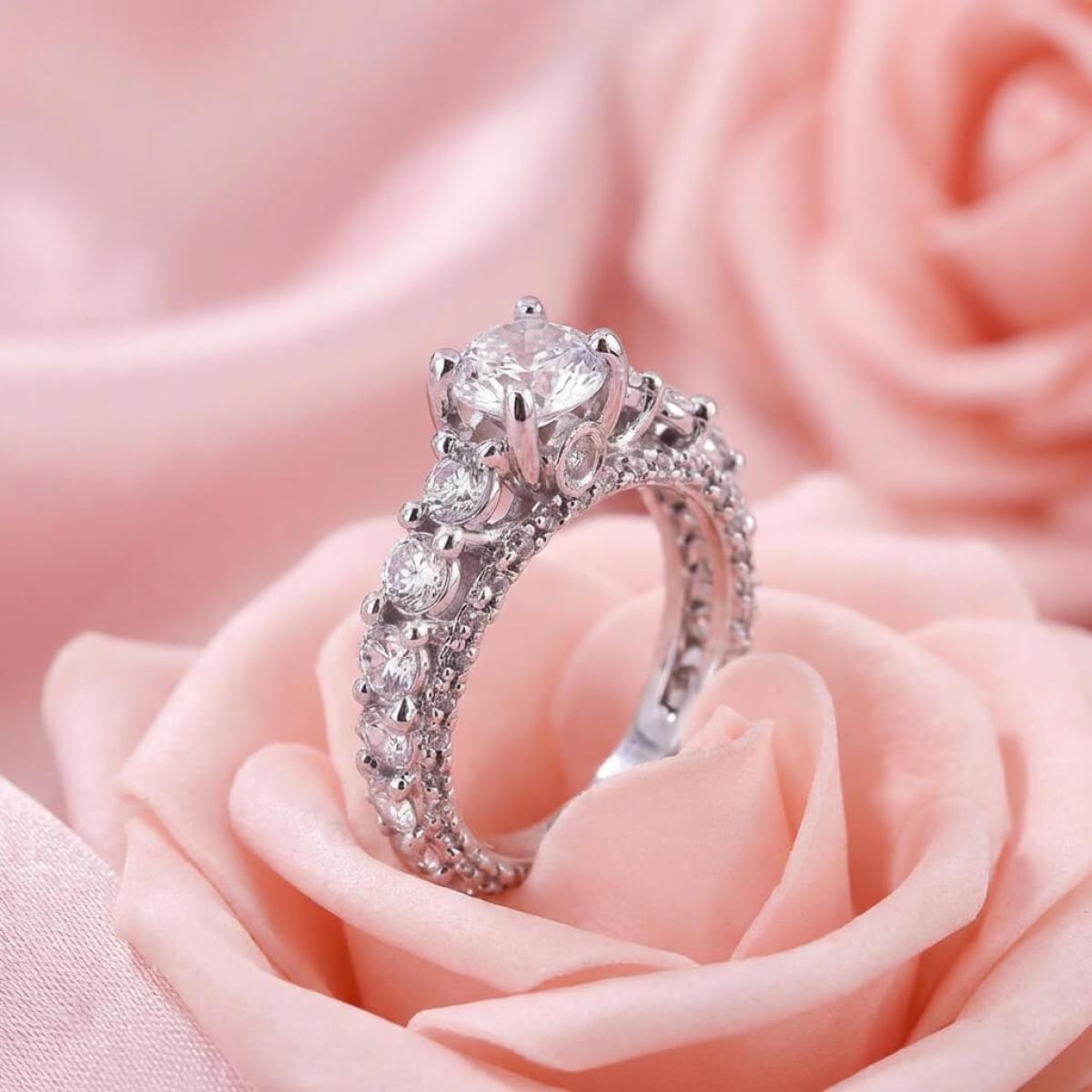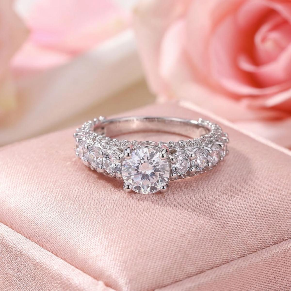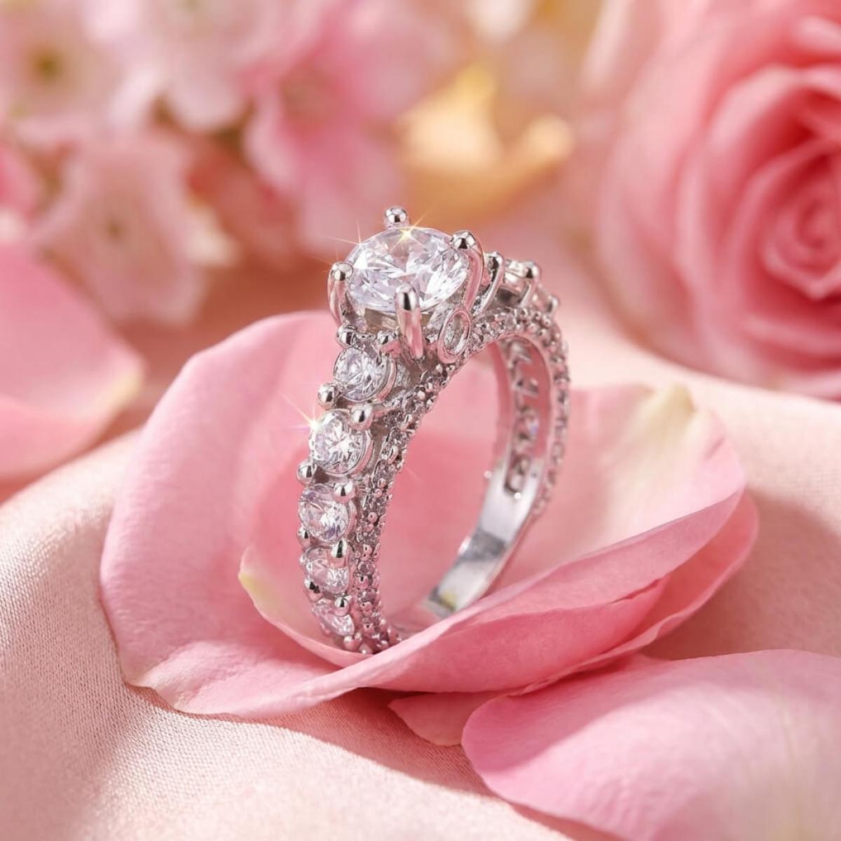 Централната точка на пръстена е украсена с изумителен циркон, който създава илюзията за искрящ диамант. Основата на пръстена е обкантена с циркони, които са известни със своята безупречна яркост и светлоотразителни свойства, което ги прави популярен избор за заместители на диамантите. Свързани с красота и вечност, цирконите символизират съвършенство и безкрайност на обещанието за вечна любов.