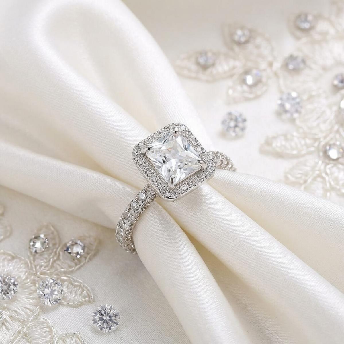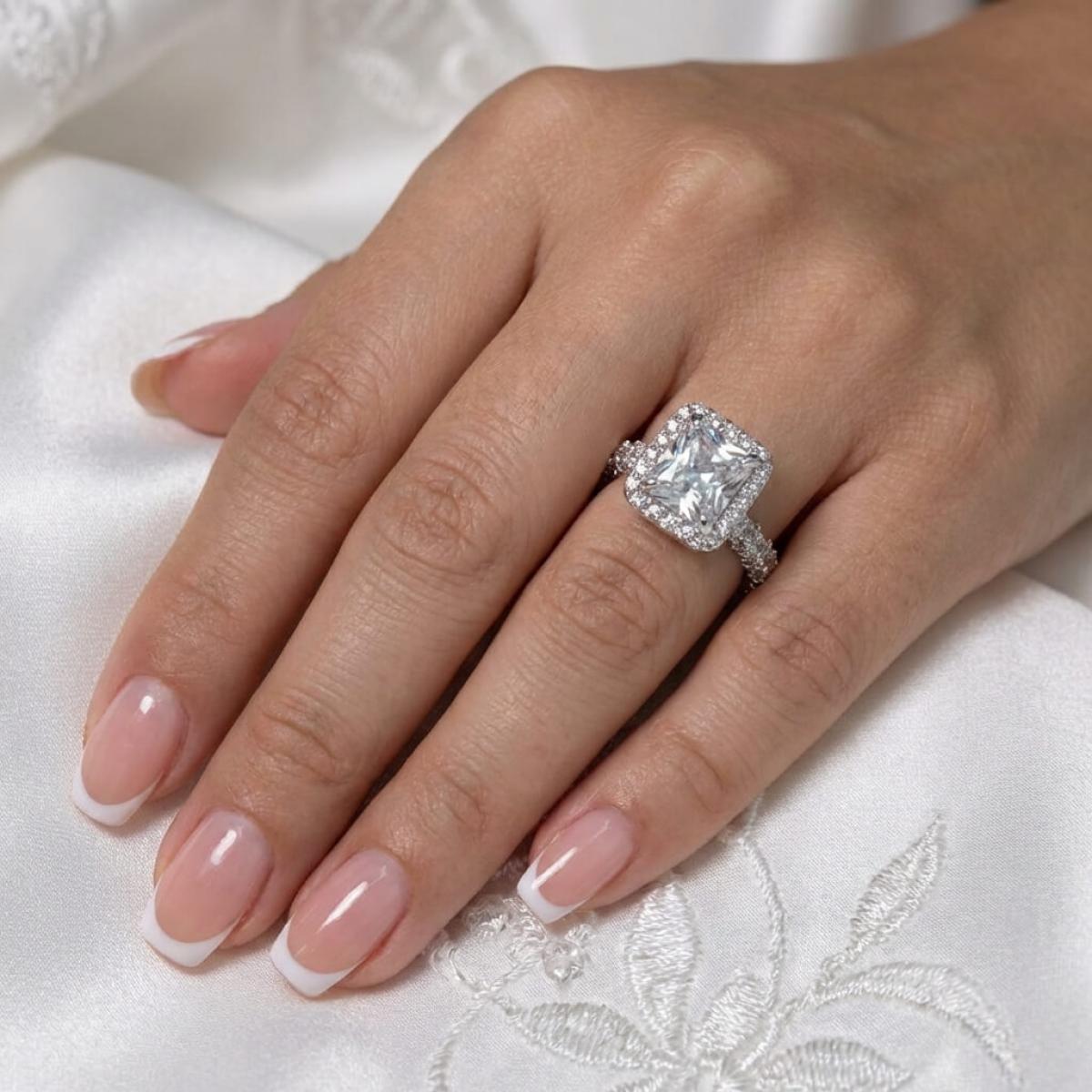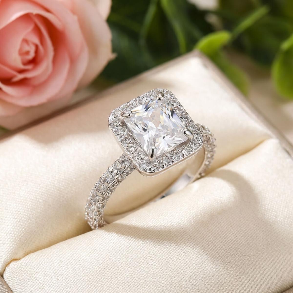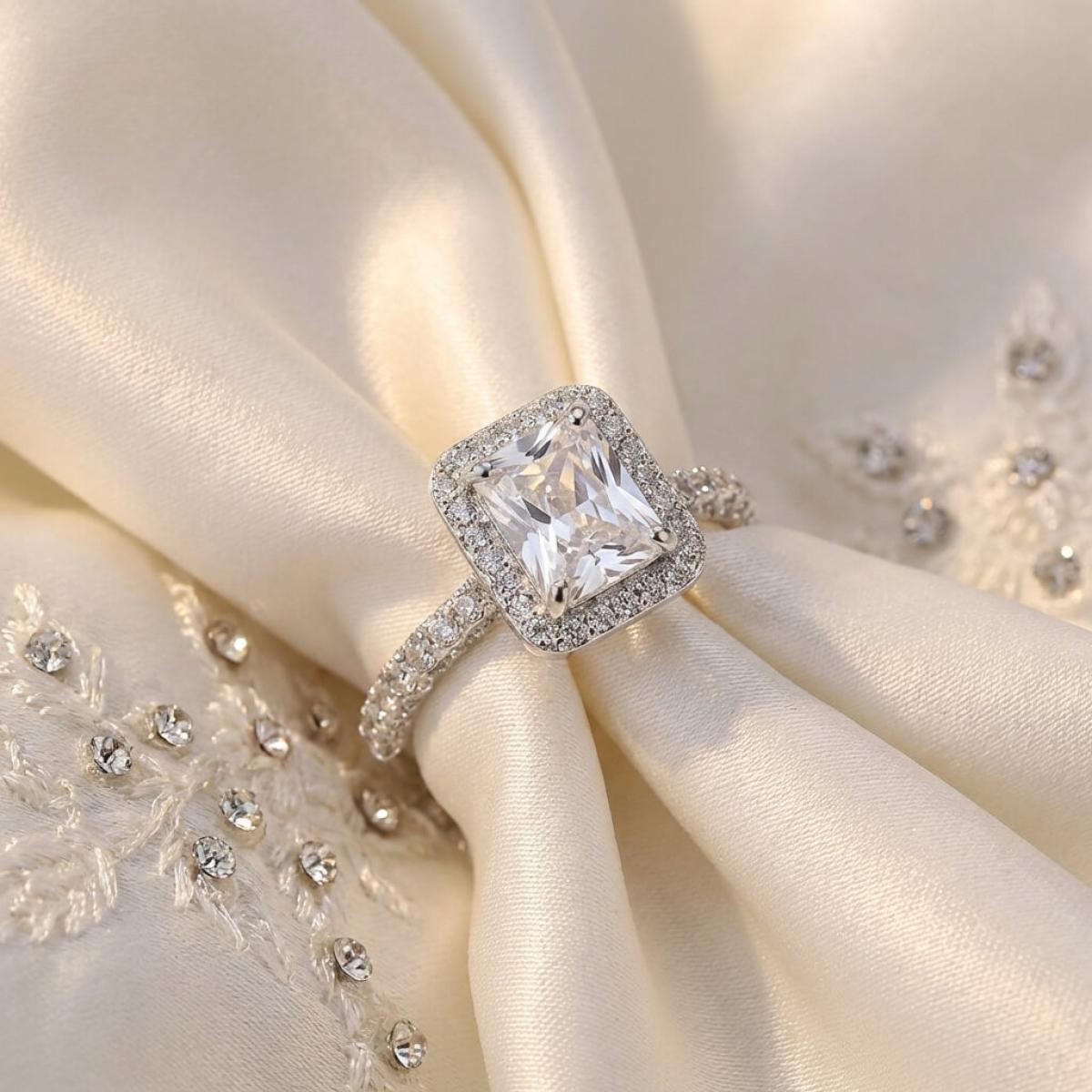 Централната точка на пръстена е украсена с изумителен правоъгълен циркон, който създава илюзията за искрящ диамант. Основата на пръстена е обкантена с циркони, които са известни със своята безупречна яркост и светлоотразителни свойства, което ги прави популярен избор за заместители на диамантите. Свързани с красота и вечност, цирконите символизират съвършенство и безкрайност на обещанието за вечна любов.