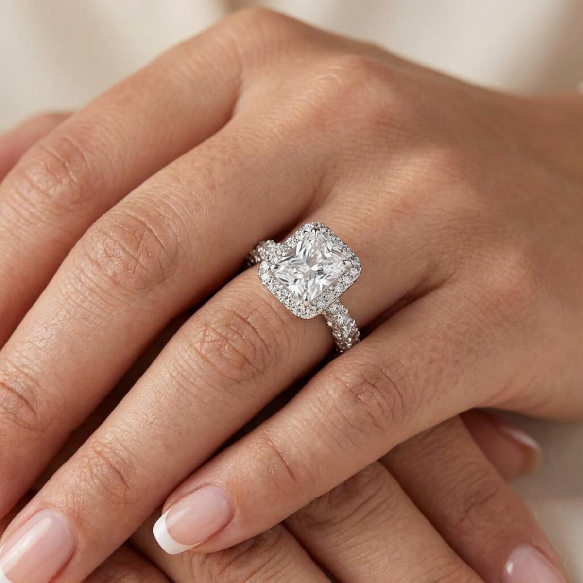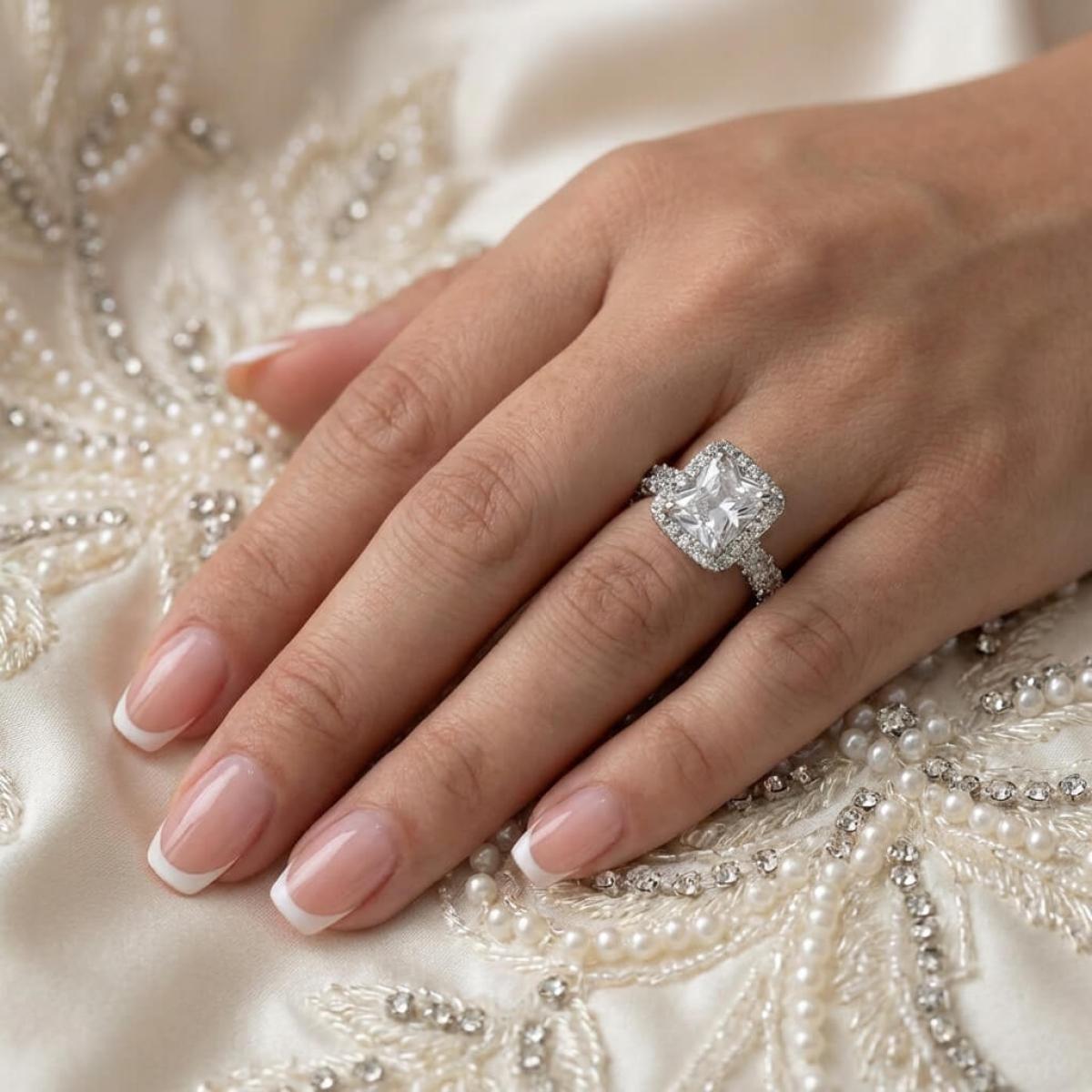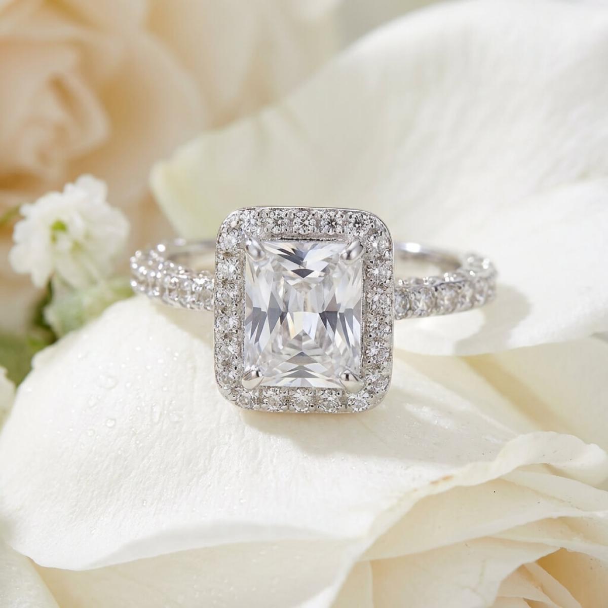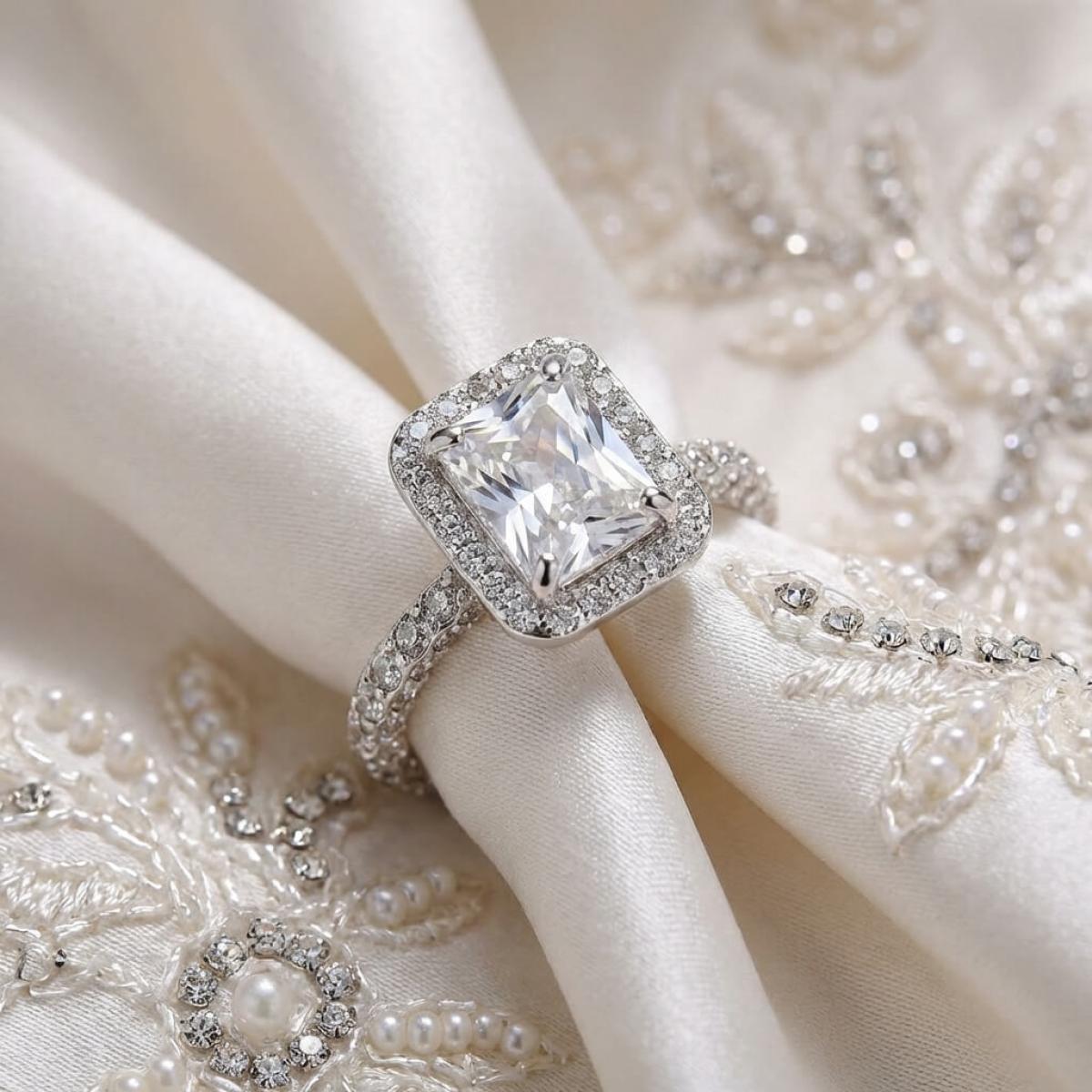 Централната точка на пръстена е украсена с изумителен правоъгълен циркон, който създава илюзията за искрящ диамант. Основата на пръстена е обкантена с циркони, които са известни със своята безупречна яркост и светлоотразителни свойства, което ги прави популярен избор за заместители на диамантите. Свързани с красота и вечност, цирконите символизират съвършенство и безкрайност на обещанието за вечна любов.