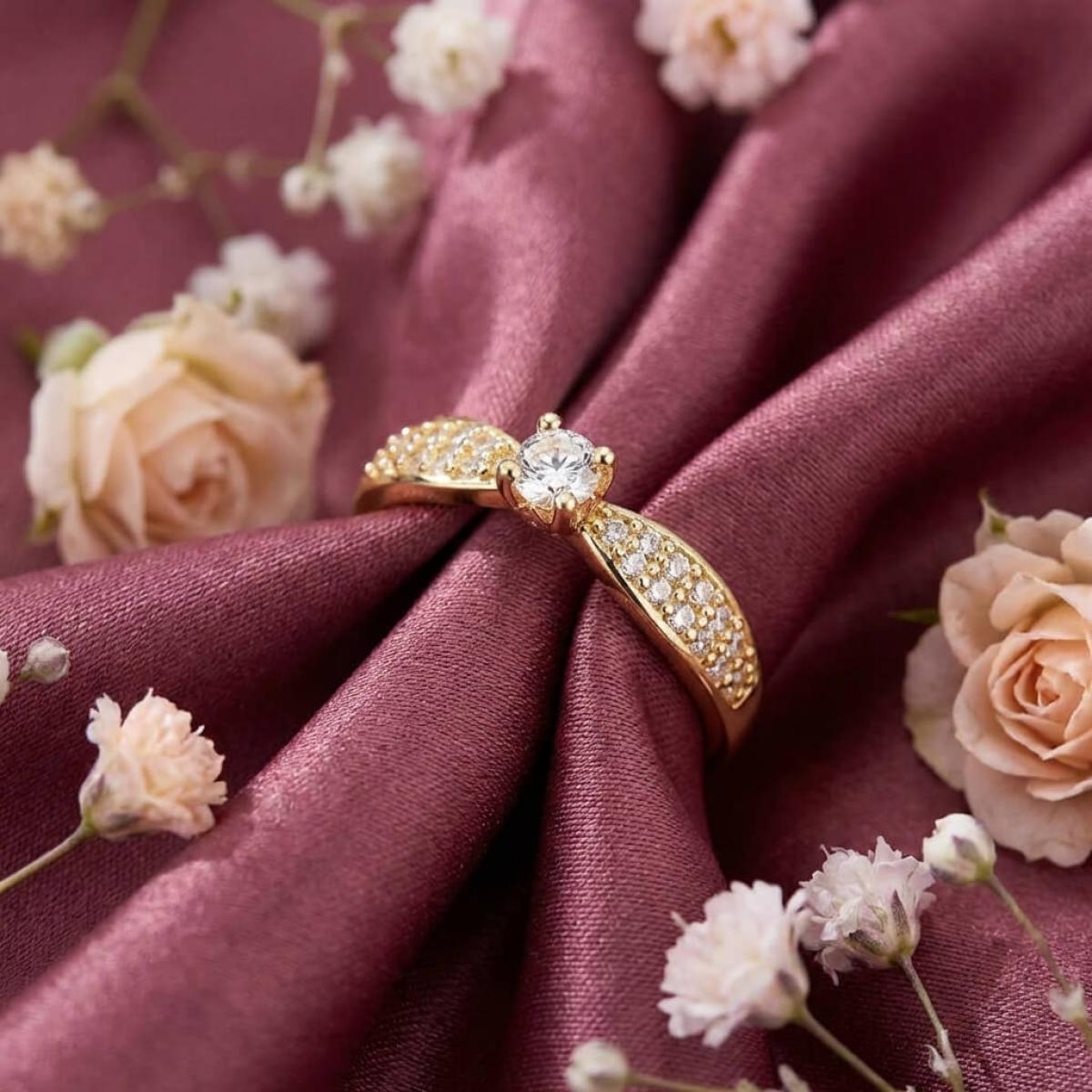 Централната точка на пръстена е украсена с изумителен циркон, който създава илюзията за искрящ диамант. Свързани с красота и вечност, цирконите символизират съвършенство и безкрайност на обещанието за вечна любов.