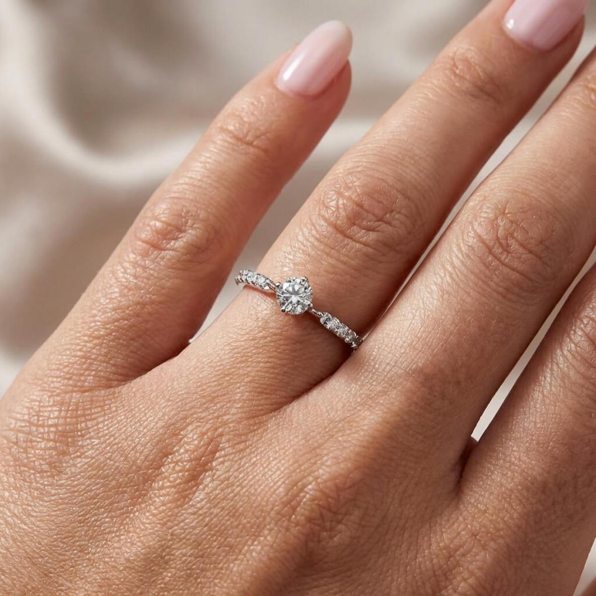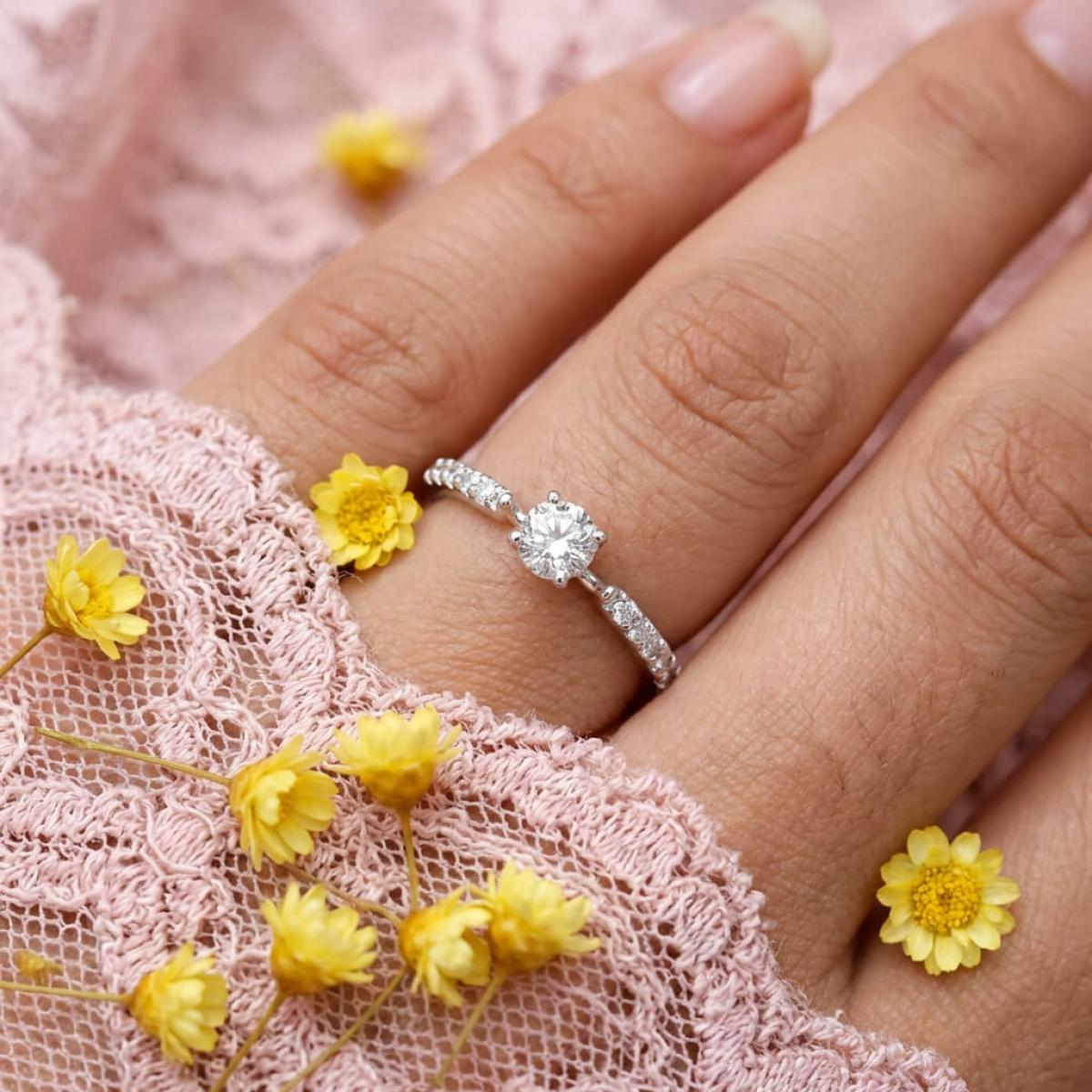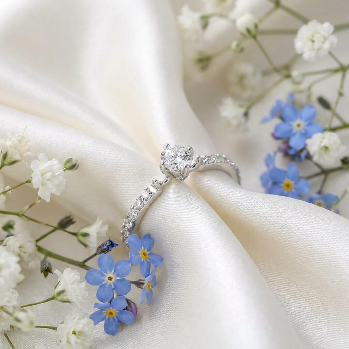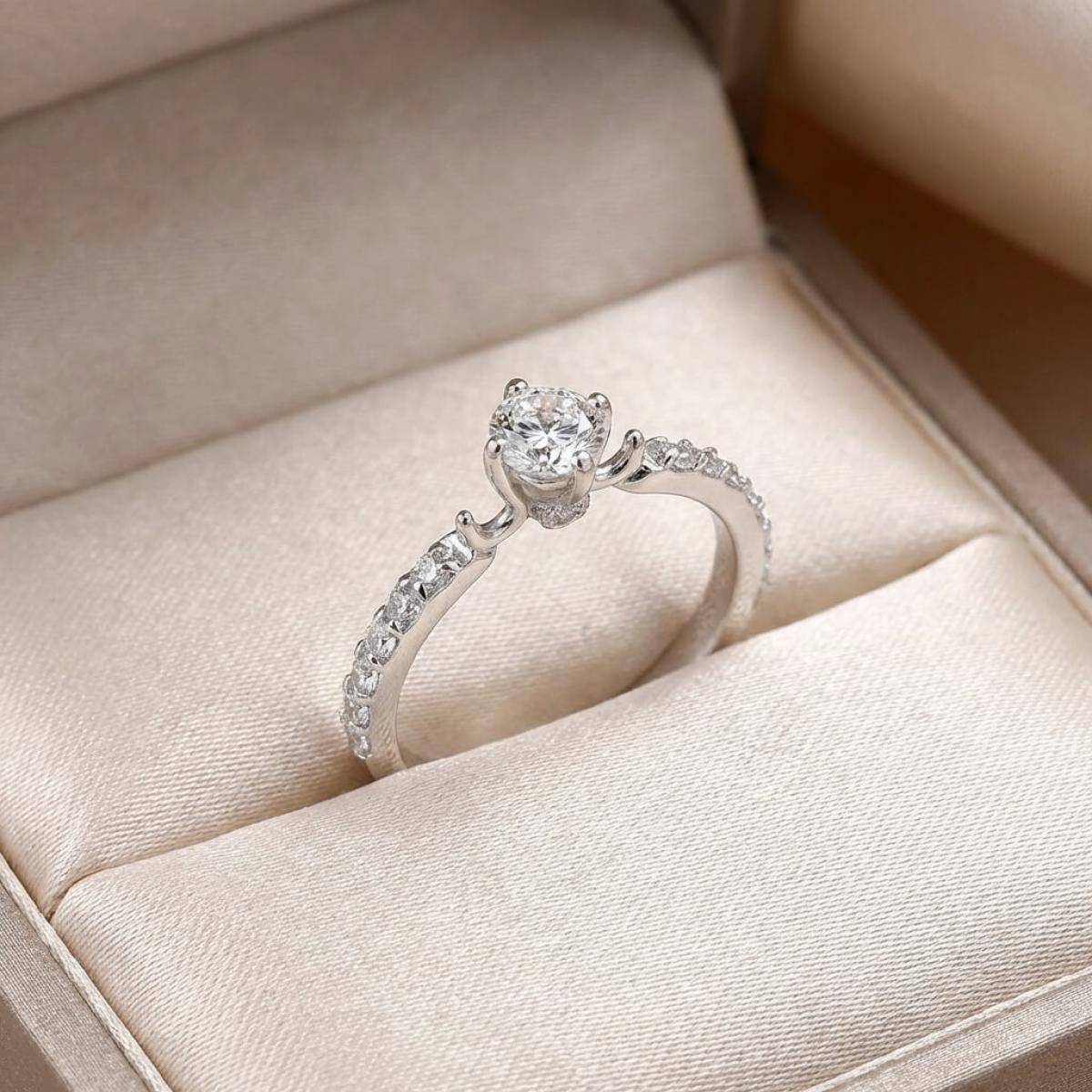 Централната точка на пръстена е украсена с изумителен циркон, който създава илюзията за искрящ диамант. По основата на пръстена има циркони, известни със своята безупречна яркост и светлоотразителни свойства, което ги прави популярен избор за заместители на диамантите. Свързани с красота и вечност, цирконите символизират съвършенство и безкрайност на обещанието за вечна любов.
