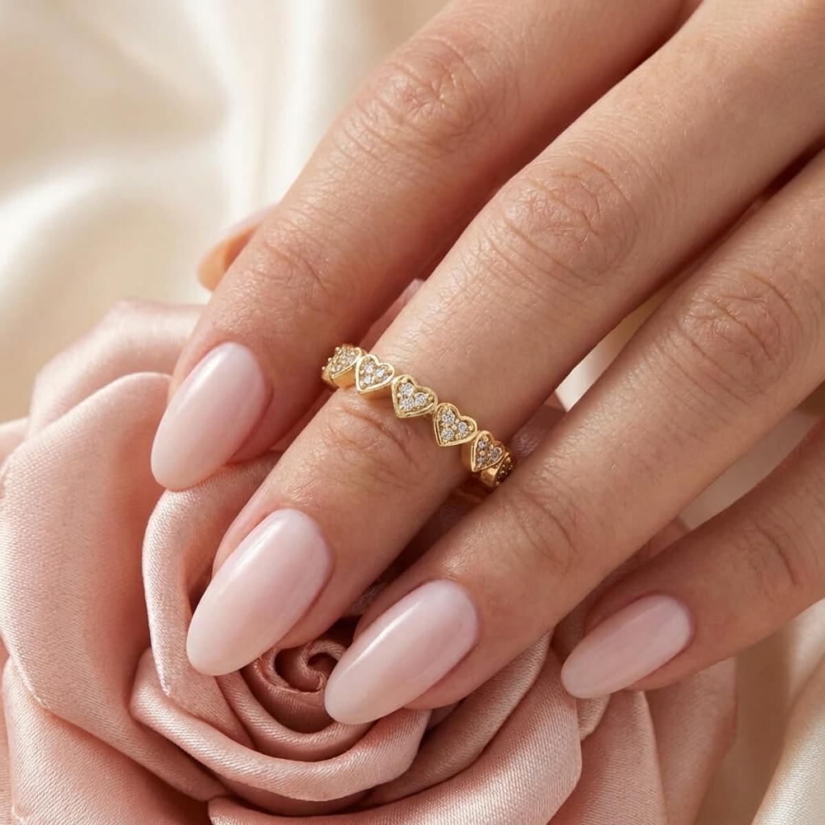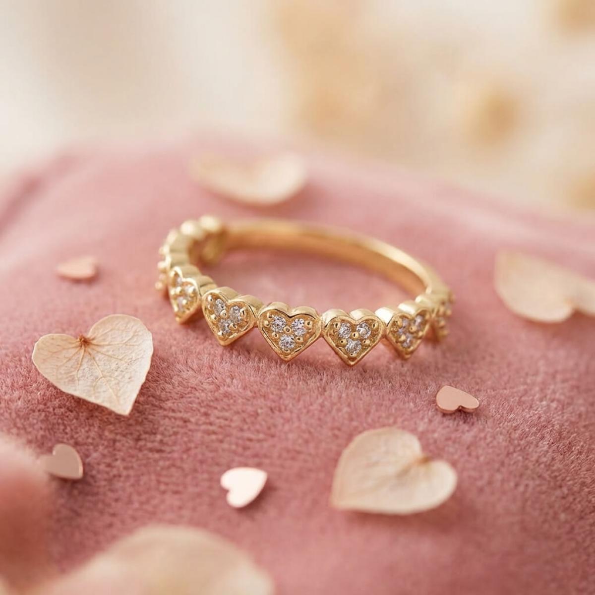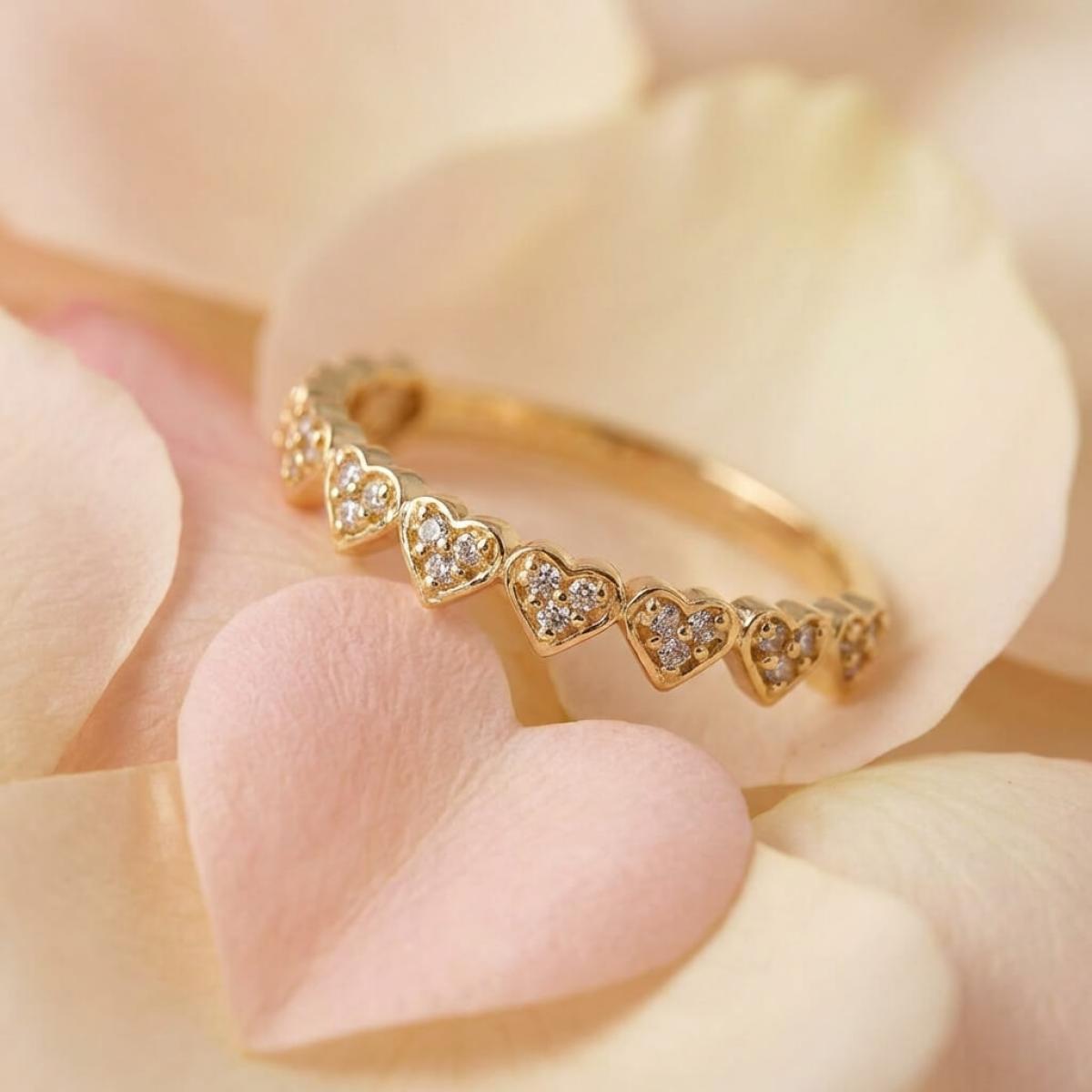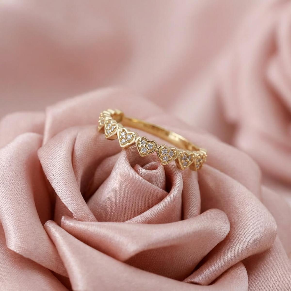 Общо 9 сърчица са разположени в горната част на пръстена. Те покриват цялата видима част на пръста, придавайки на женската ръка обаятелност и изтънченост. Във всяко сърце са инкрустирани няколко циркона. Камъните отразяват светлината по един вълшебен начин, подсилвайки също естествения блясък на златото.