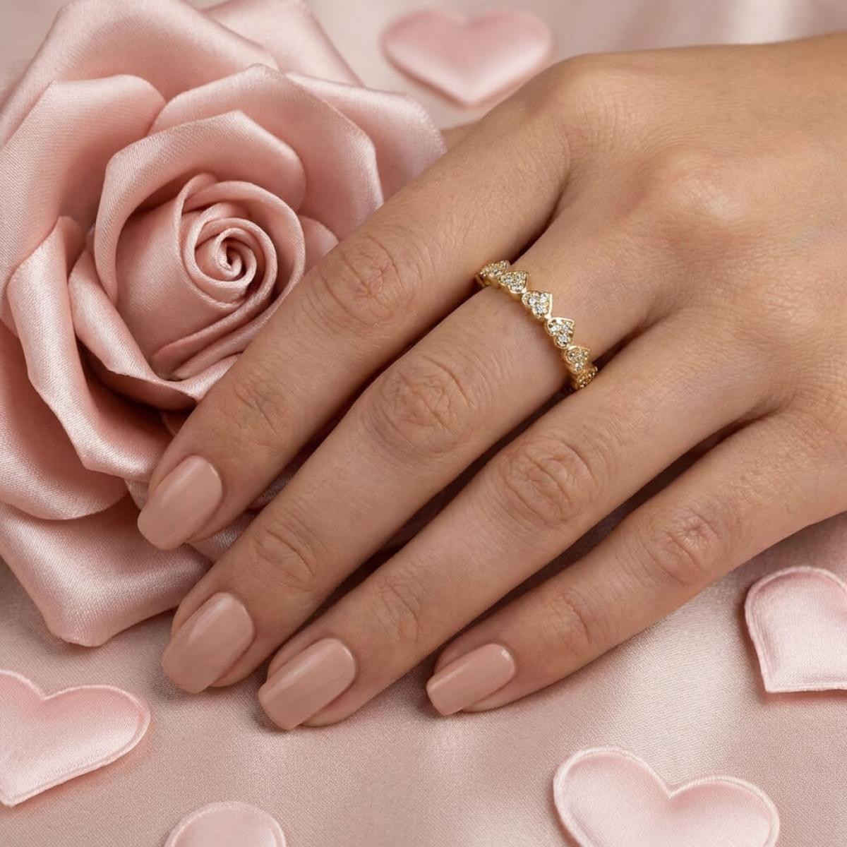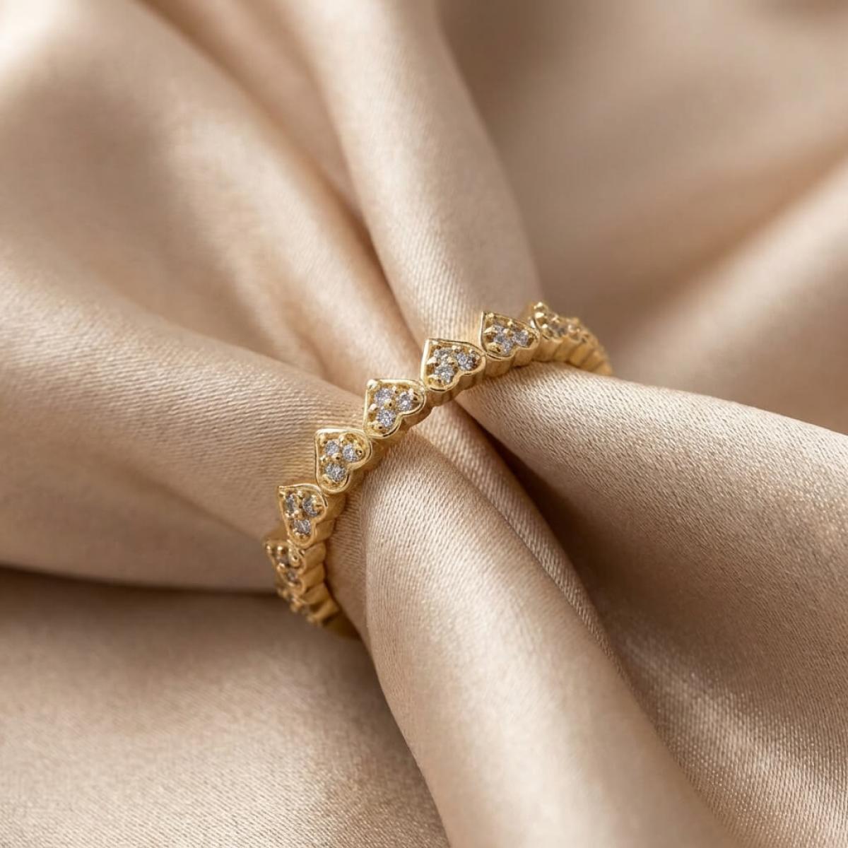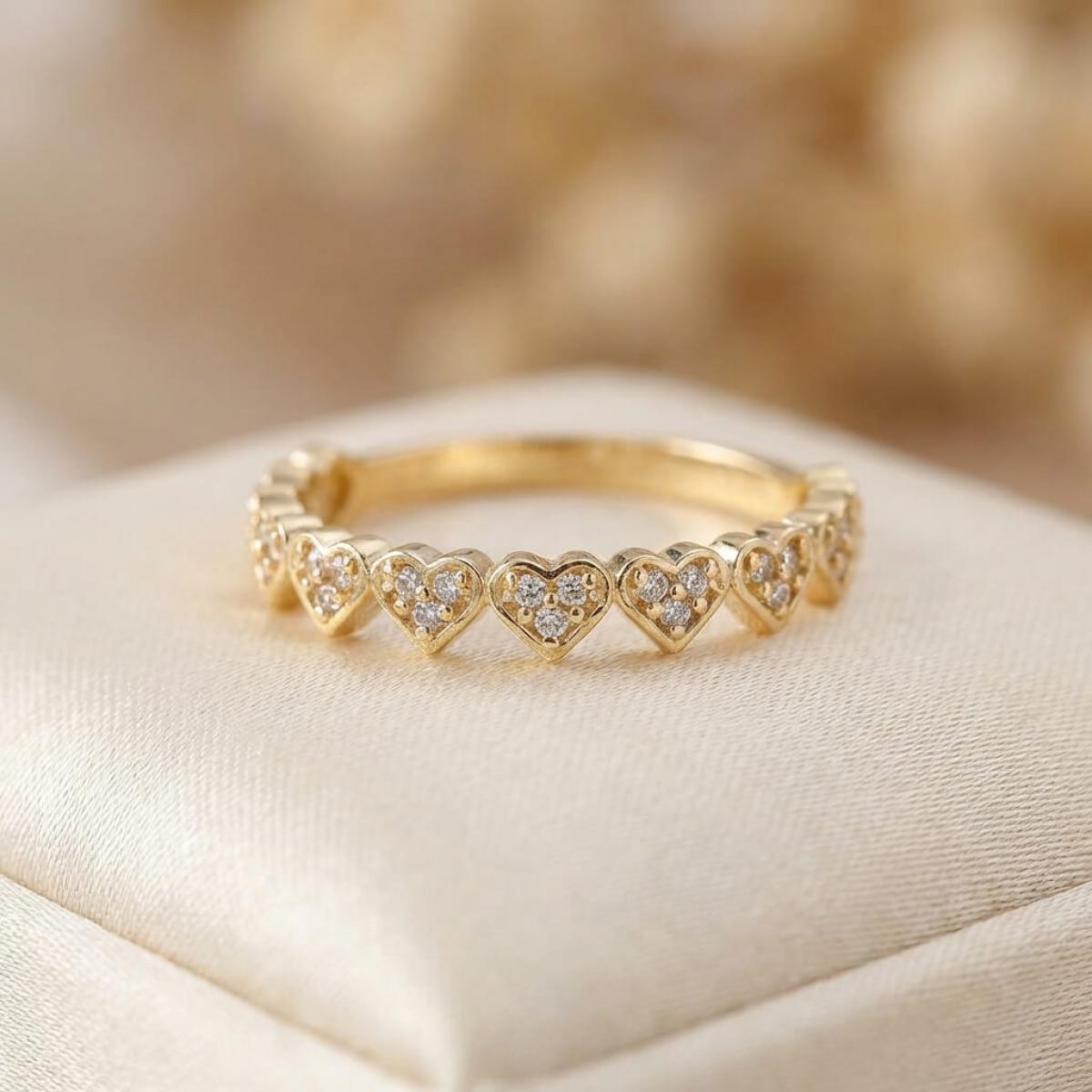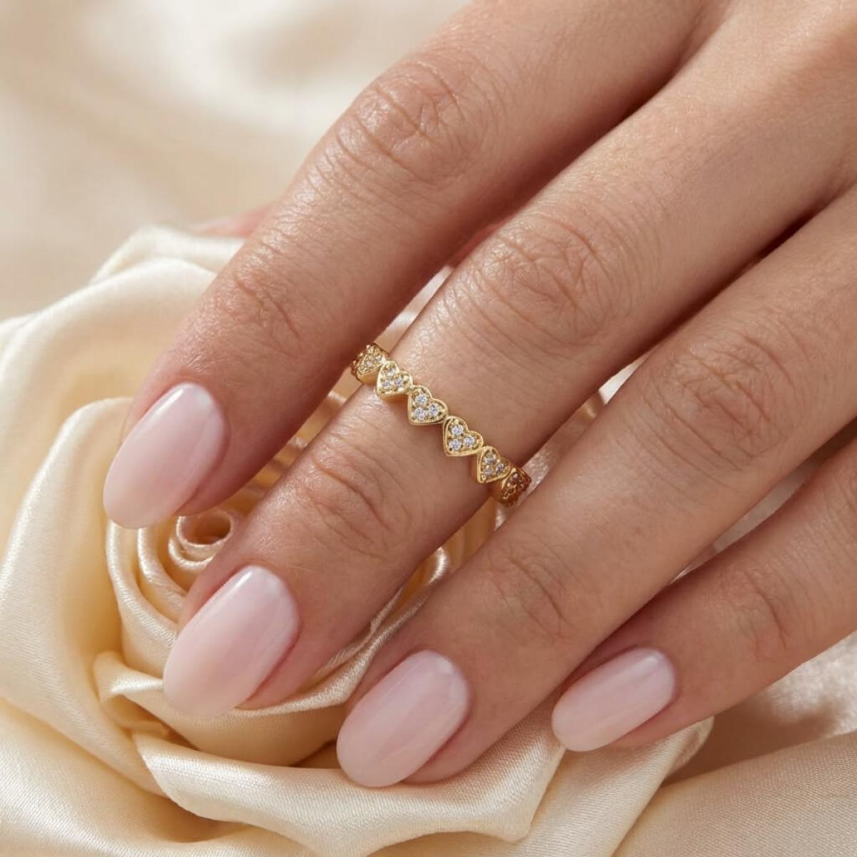 Общо 9 сърчица са разположени в горната част на пръстена. Те покриват цялата видима част на пръста, придавайки на женската ръка обаятелност и изтънченост. Във всяко сърце са инкрустирани няколко циркона. Камъните отразяват светлината по един вълшебен начин, подсилвайки също естествения блясък на златото.