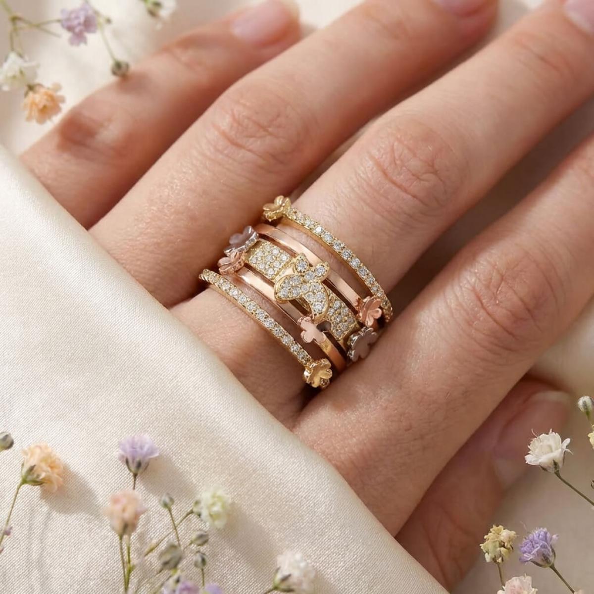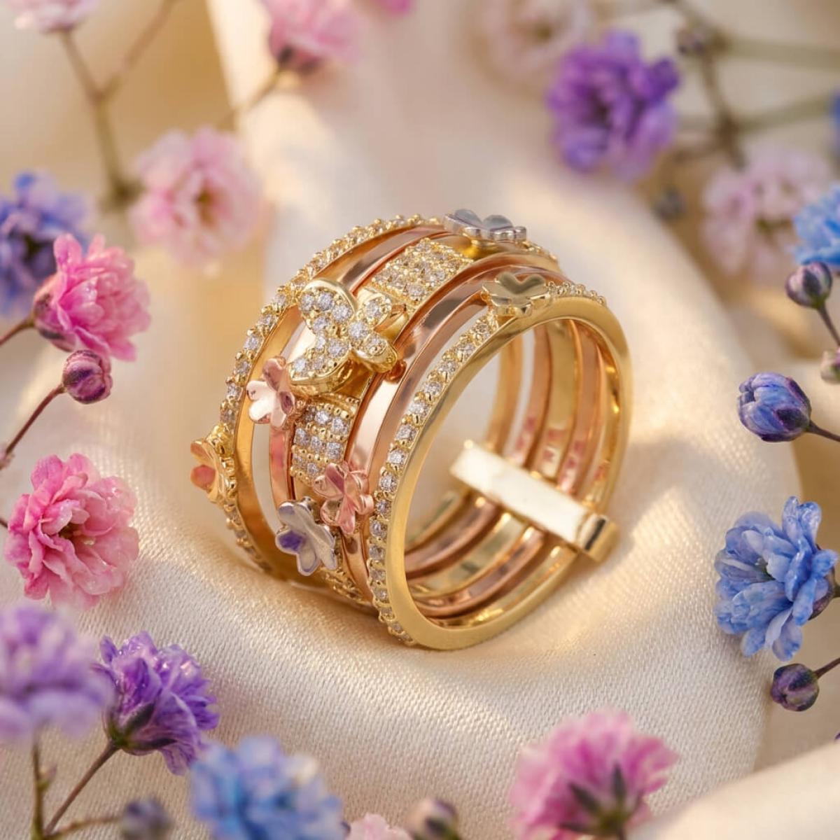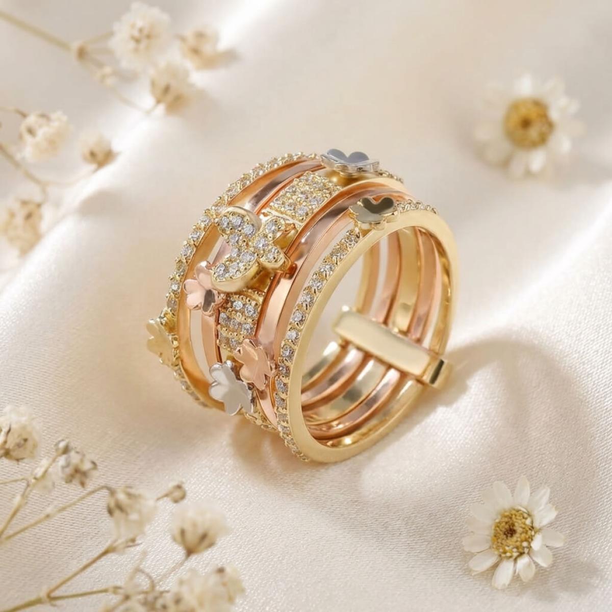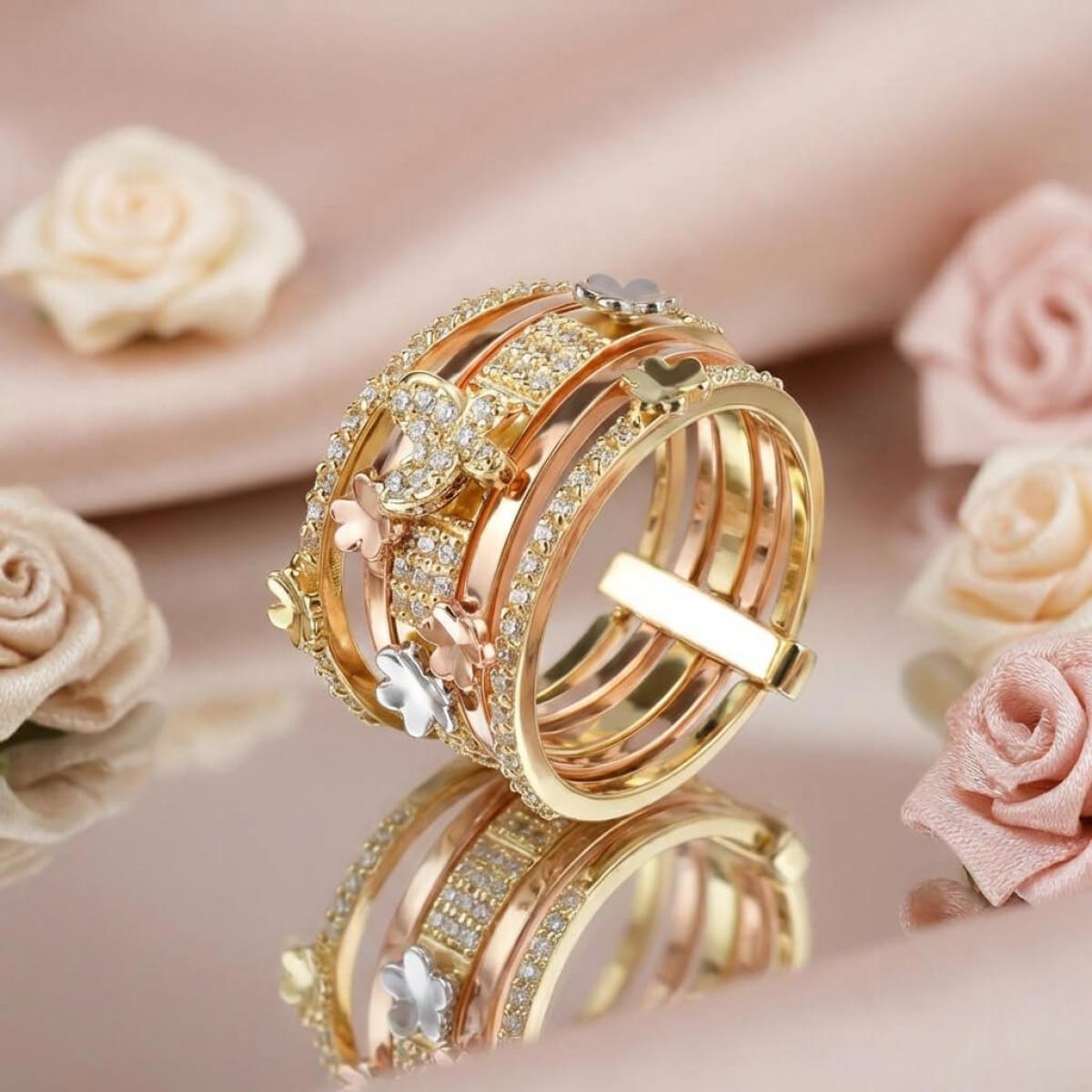 Дамски златен пръстен с циркони от бяло, жълто и розово злато. Обсипан с циркони и малки елементи във формата на цветя и пеперуди