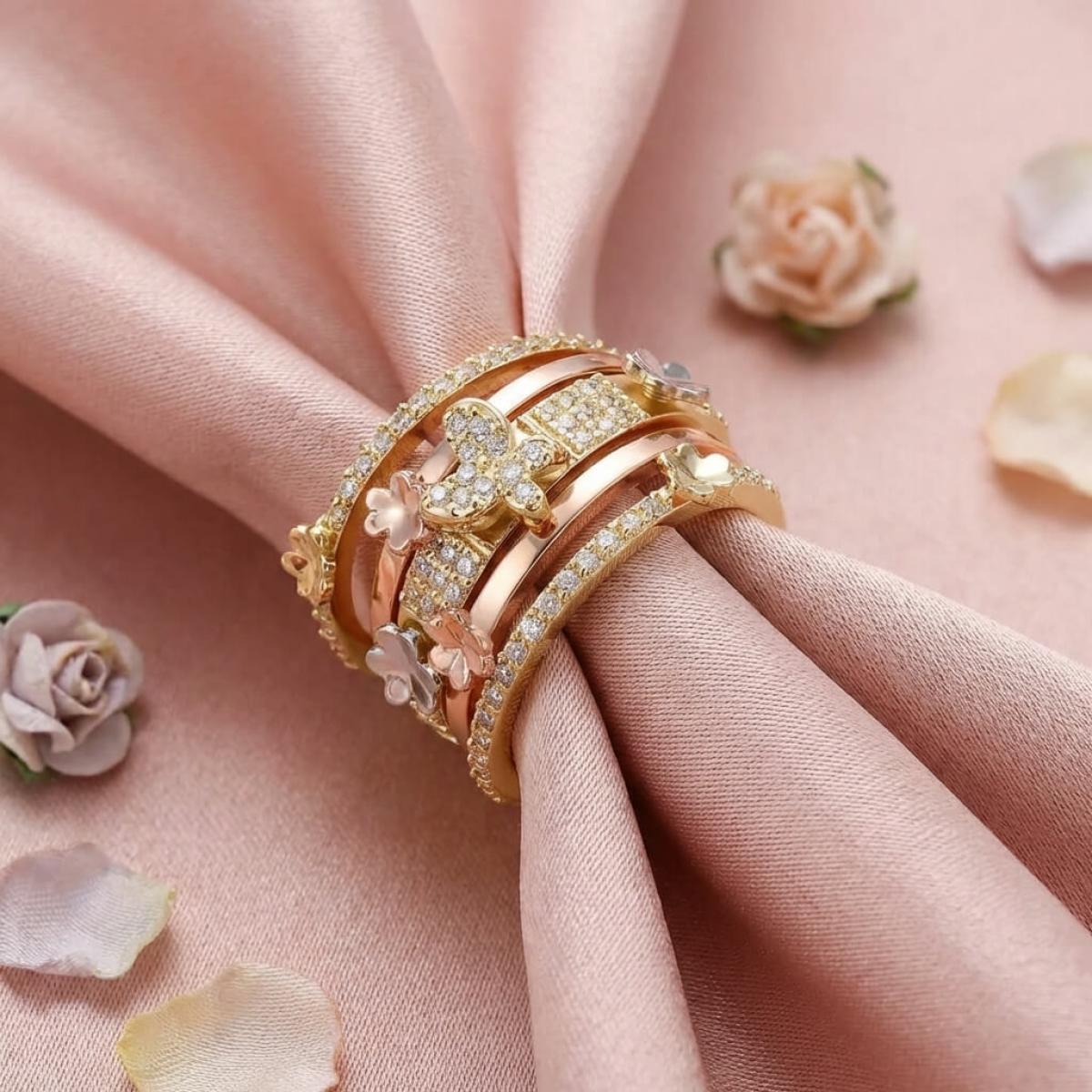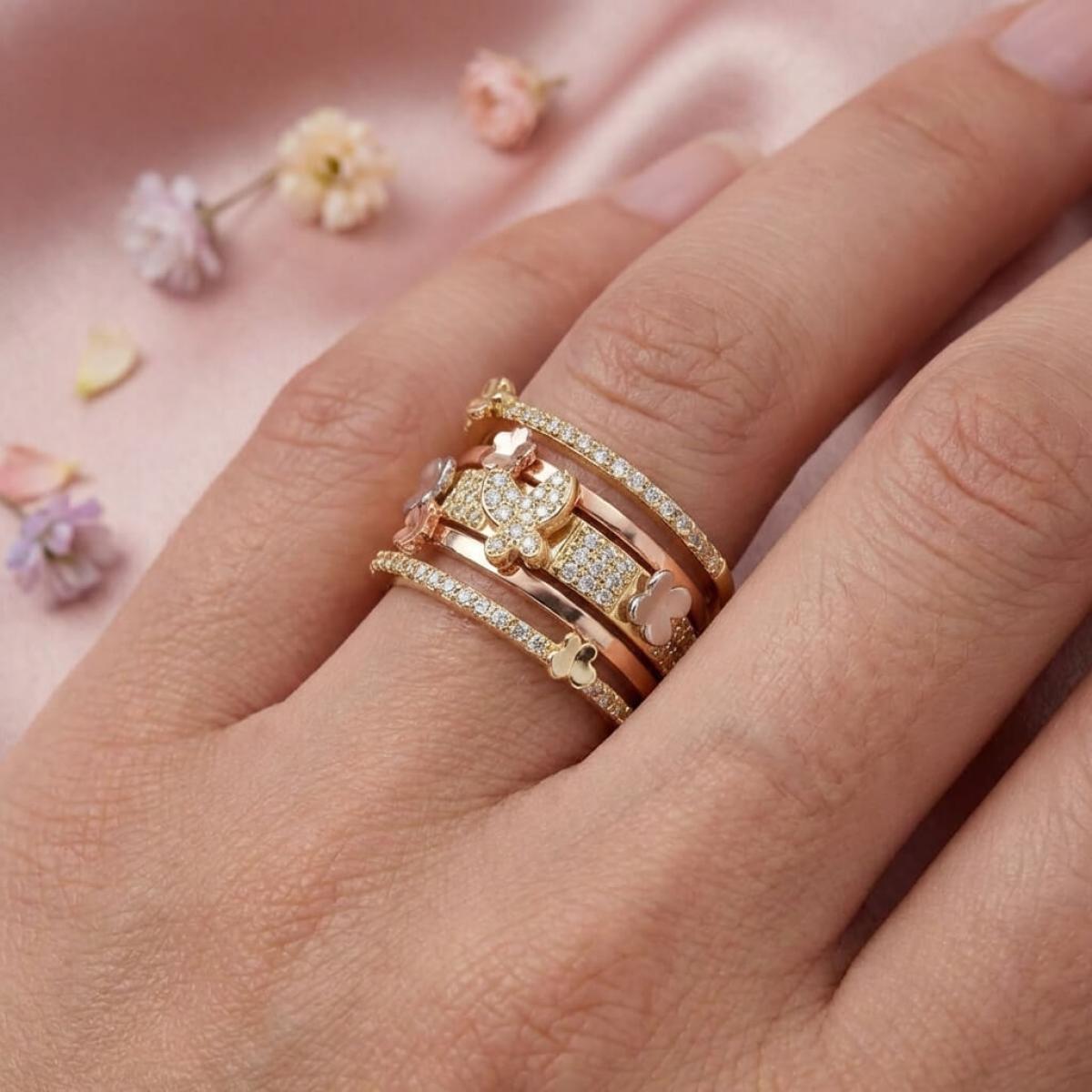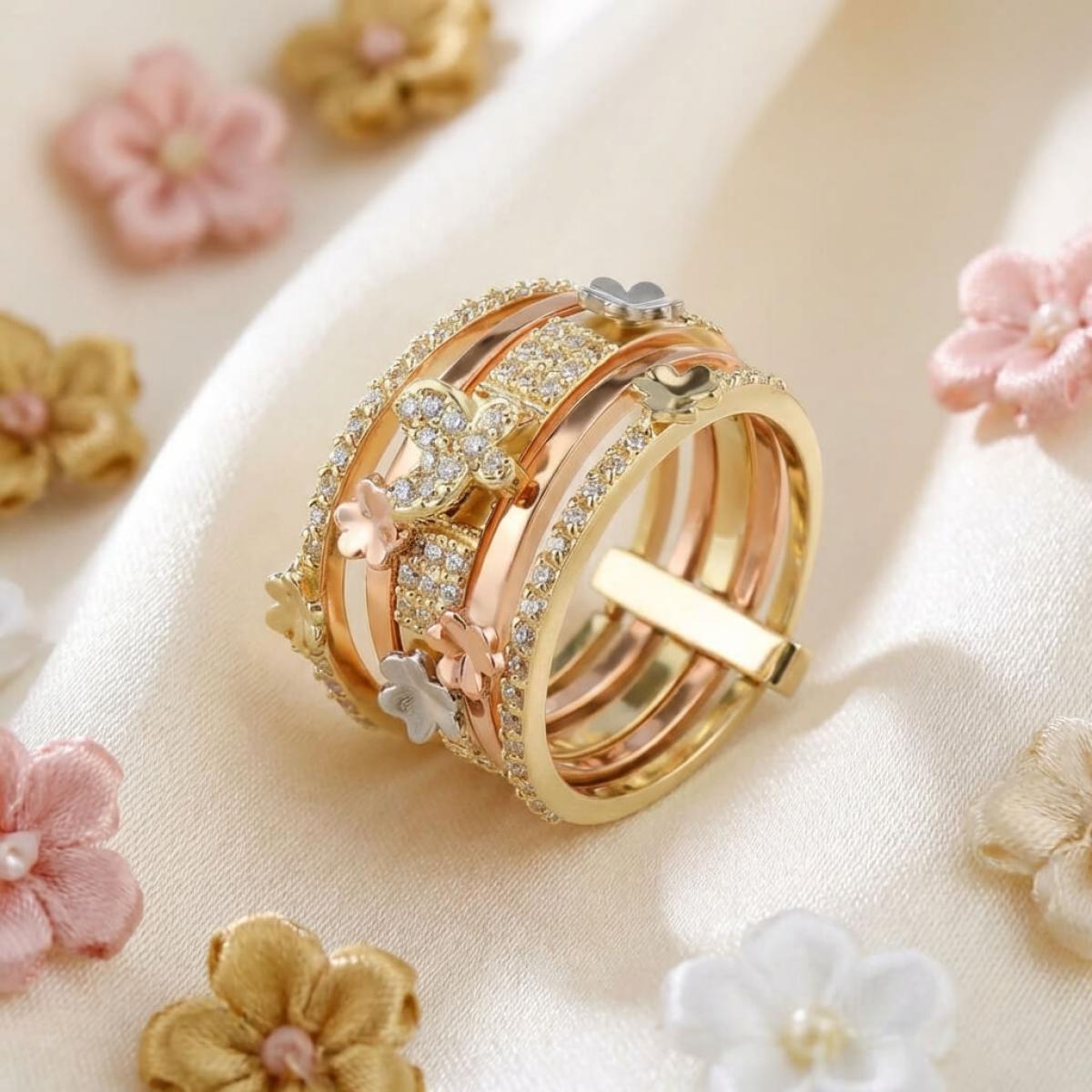 Дамски златен пръстен с циркони от бяло, жълто и розово злато. Обсипан с циркони и малки елементи във формата на цветя и пеперуди