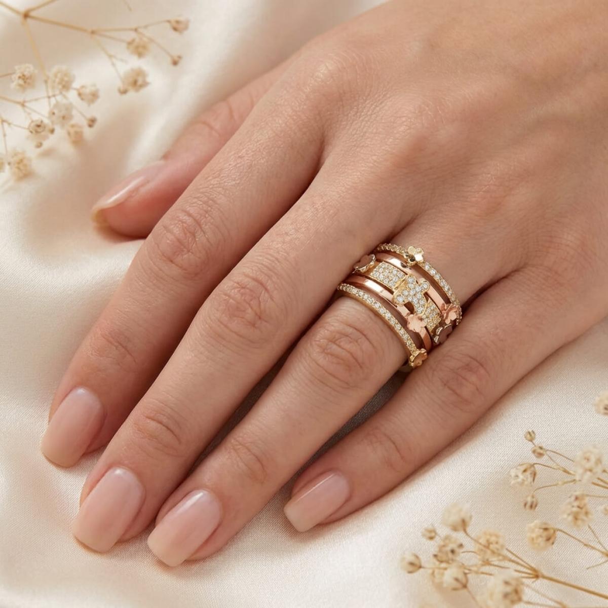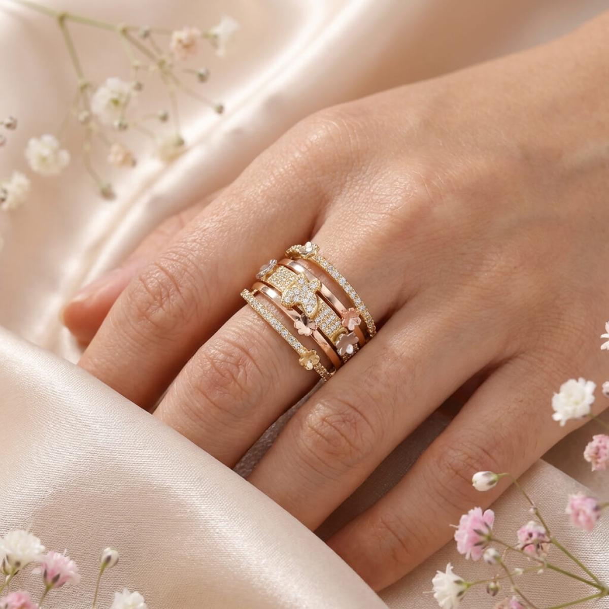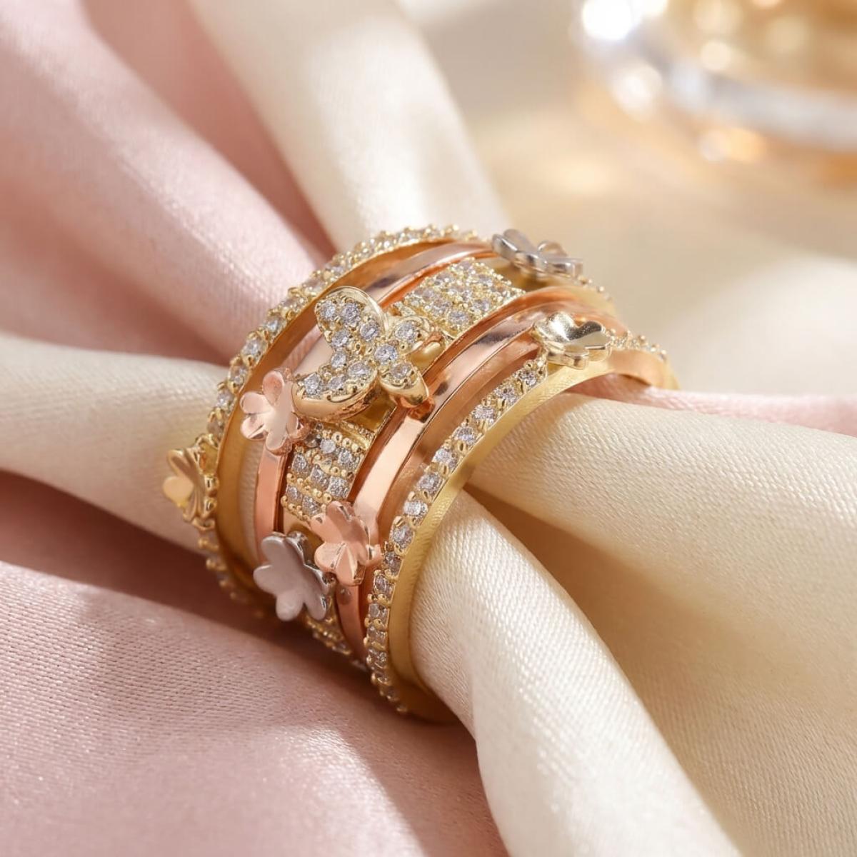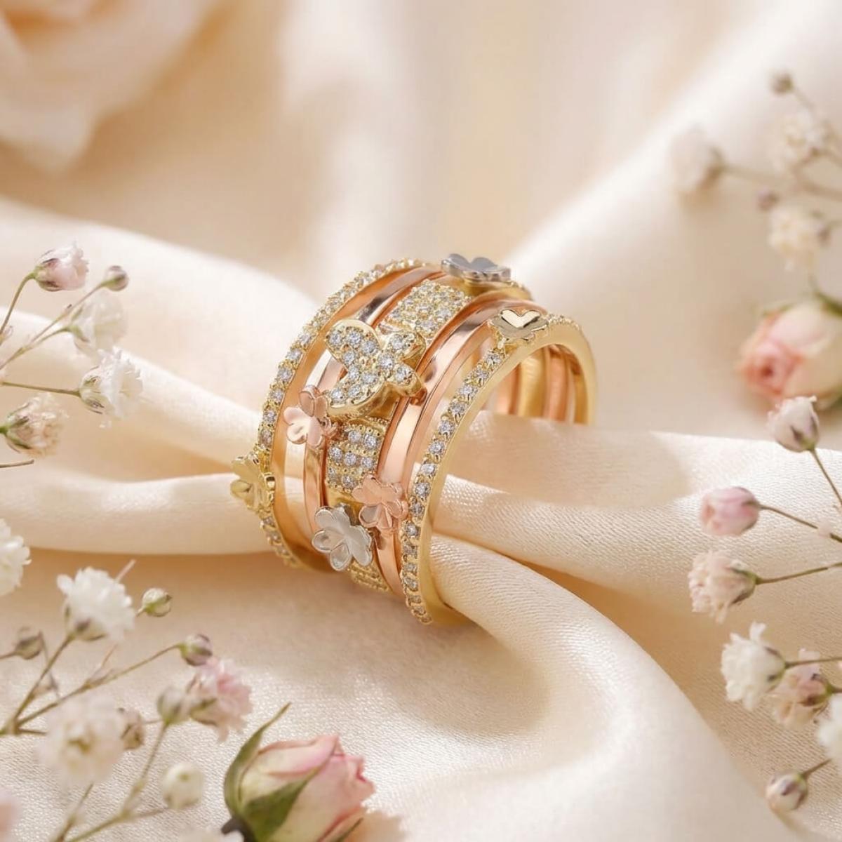 Дамски златен пръстен с циркони от бяло, жълто и розово злато. Обсипан с циркони и малки елементи във формата на цветя и пеперуди