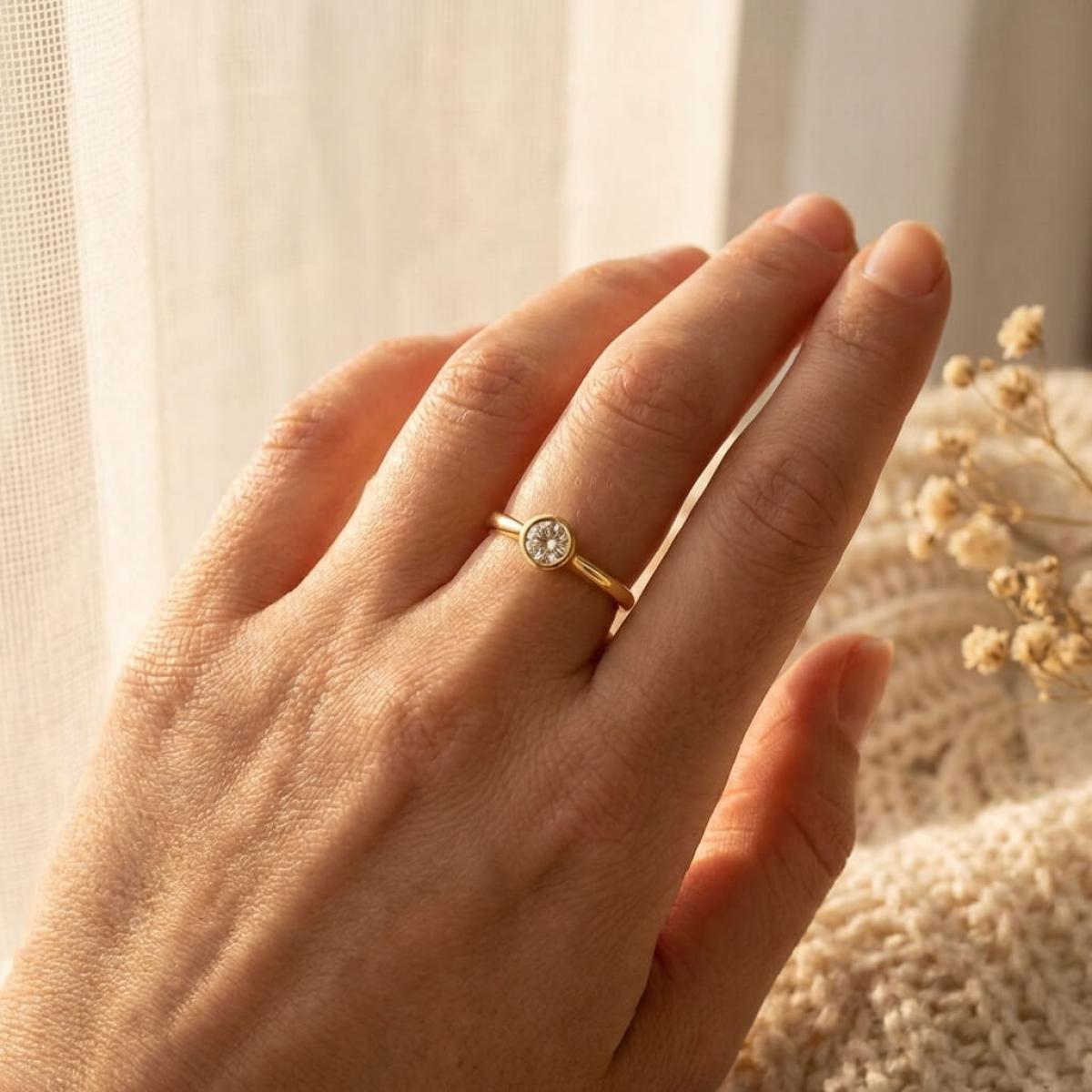 Пръстенът е изработен от 14-каратово злато проба 585.