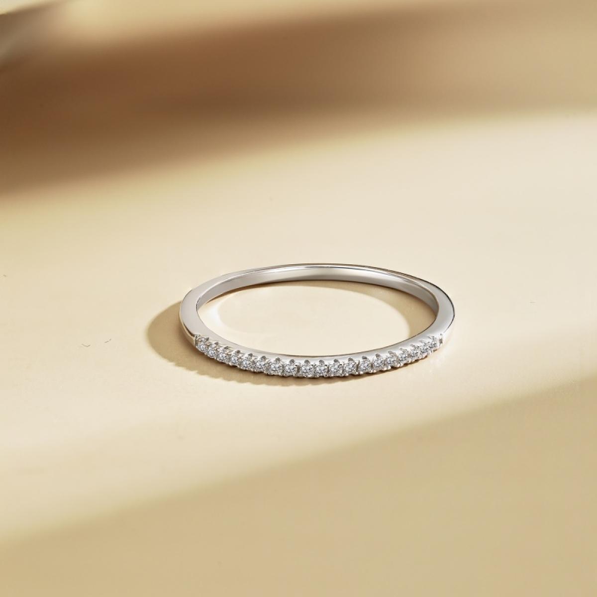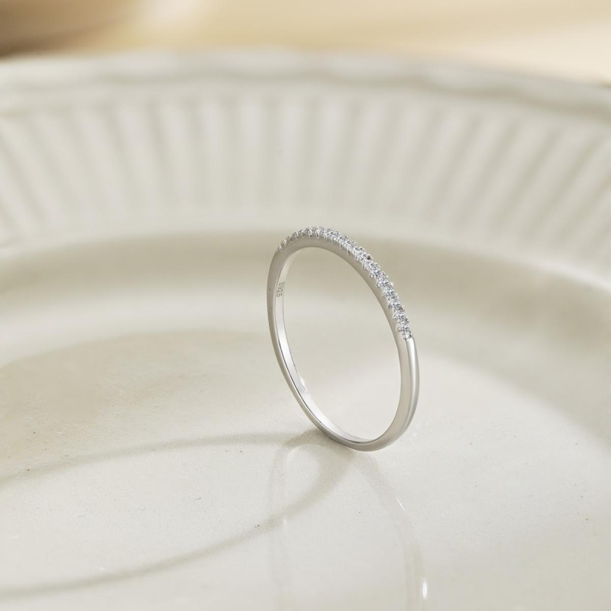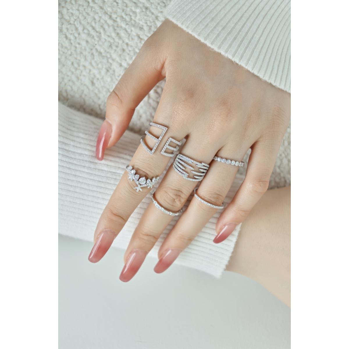 Структурно, пръстенът е разделен на множество сегменти, върху всеки от които е инкрустиран по един прозрачен циркон. По този начин халката прилича на зъбно колело, погледната отстрани. Малко бижута съчетават така добре изчистен дизайн и невероятно стилна концепция. Можете да поднесете това красиво бижу като един излизащ от стандартите годежен пръстен.