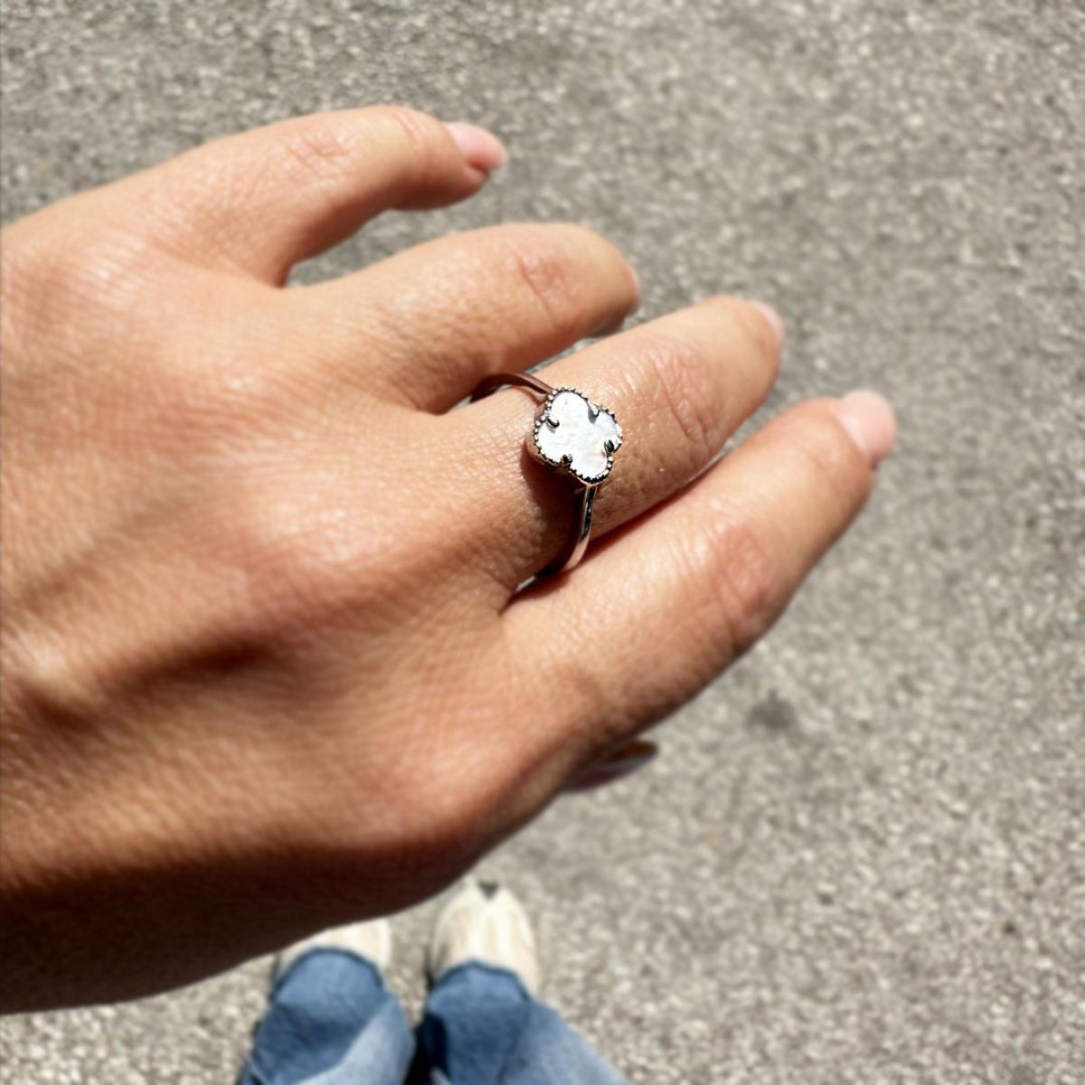 Елегантен и нежен сребърен пръстен, изработен от висококачествено сребро проба 925, украсен с бял седеф, който излъчва фин блясък и чистота. Седефът е известен със своята мекота и хармония – символ на спокойствие, женственост и вътрешен баланс.
