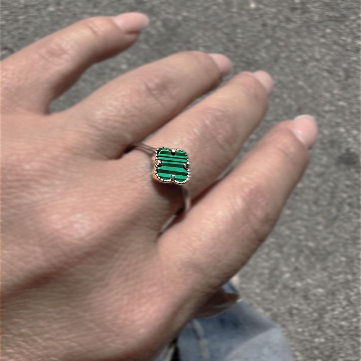 Стилен и впечатляващ сребърен пръстен, изработен от сребро проба 925, инкрустиран с малахит – камък, известен със своите наситени зелени нюанси и енергия на защита и преобразяване. Малахитът символизира баланс, мъдрост и вътрешна сила, а неговите уникални шарки правят всяко бижу неповторимо.